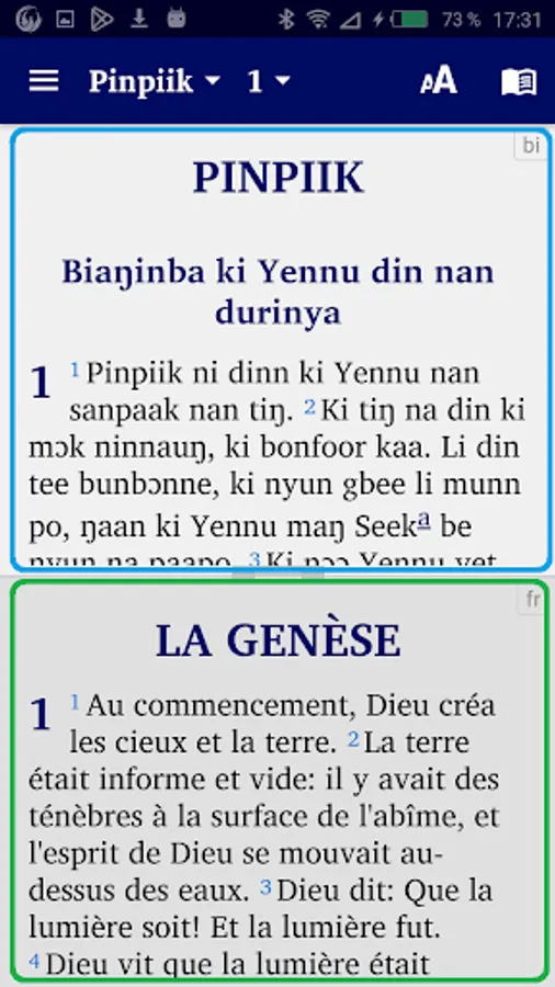 - "verse by verse" to display a verse in Bimoba followed by the same verse in English or in French.
