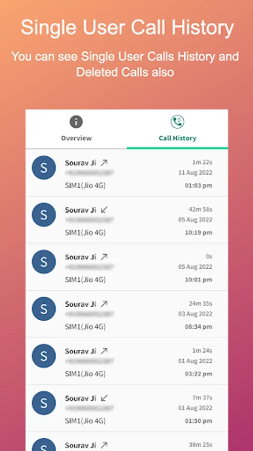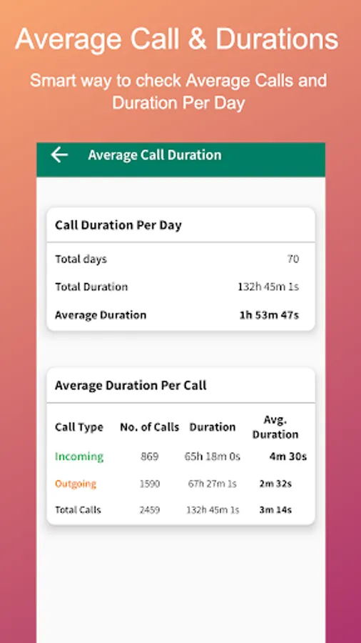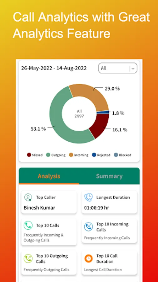 Analyse Top Caller, Longest Duration Call, Average Call, Average Call Durations, Most Frequent Incoming Calls, Most Frequent Outgoing Calls and Most Interacted Call, Unknown Calls, Never attend calls. Advanced Filter helps you analyse and monitor calls for your required specific period.
