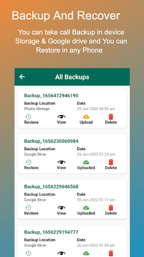- Access your backed up call logs data uploaded to Google Drive within the app.