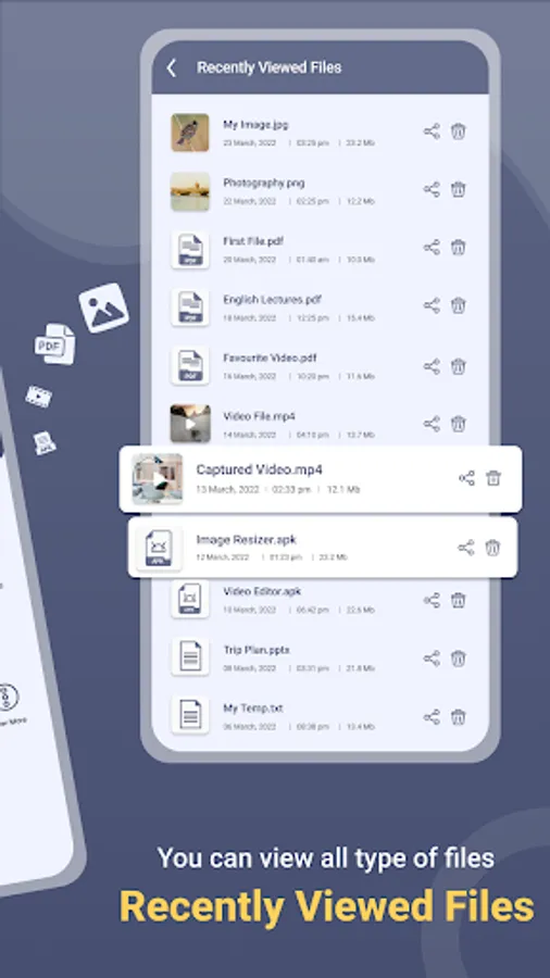6. Another important feature of Bin File Opener - Viewer is recent files. It allows the user to view the recently viewed files directly from this feature, without closing the app. in addition, the user can delete and share the file directly from the app.