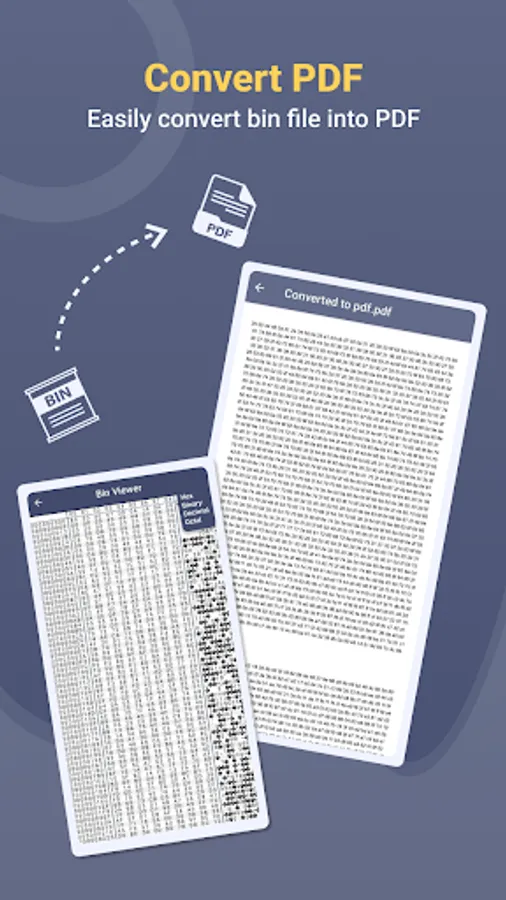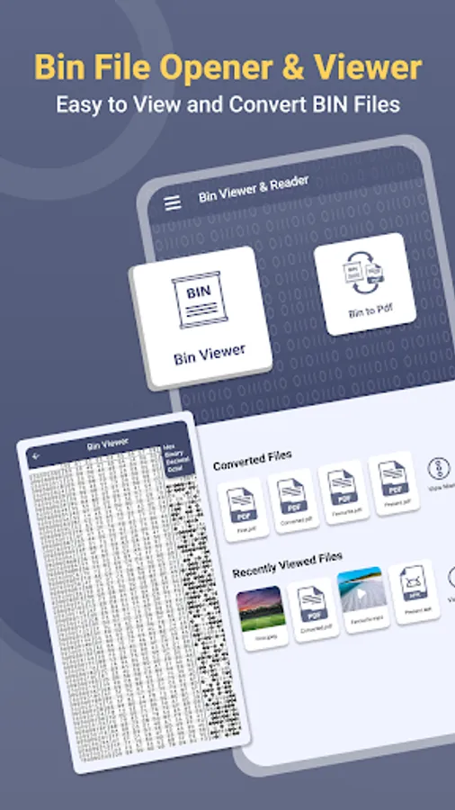 1. Bin File Opener - Viewer is a mobile-friendly app. Its interface has four main tabs: Bin viewer, Bin to Pdf, recent files, and converted files.