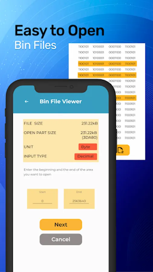 Android Bin File Opener: An application designed to open various types of bin files. Bin reader allows you to choose any bin file stored on your Android device and view its binary codes in either decimal or hexadecimal format.