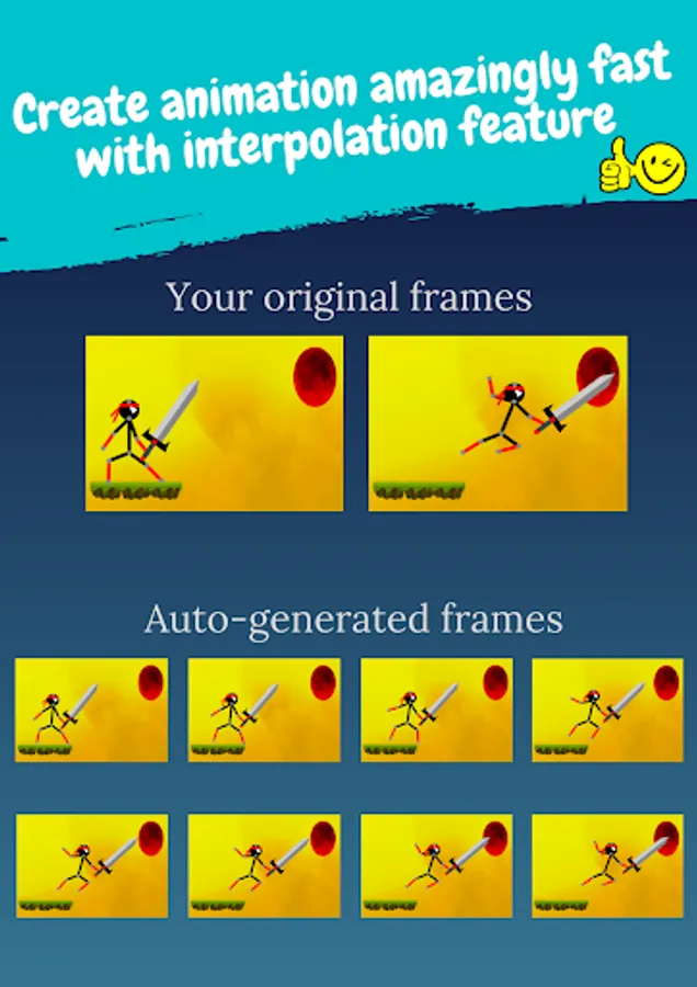The app has Interpolation feature, which is the ability to “fill the gap” between the frames to make your animation smoother. For example, with only two separate frames, the app can generate an animation with quality of up to hundreds of FPS (please see the promo images above for more visual description)