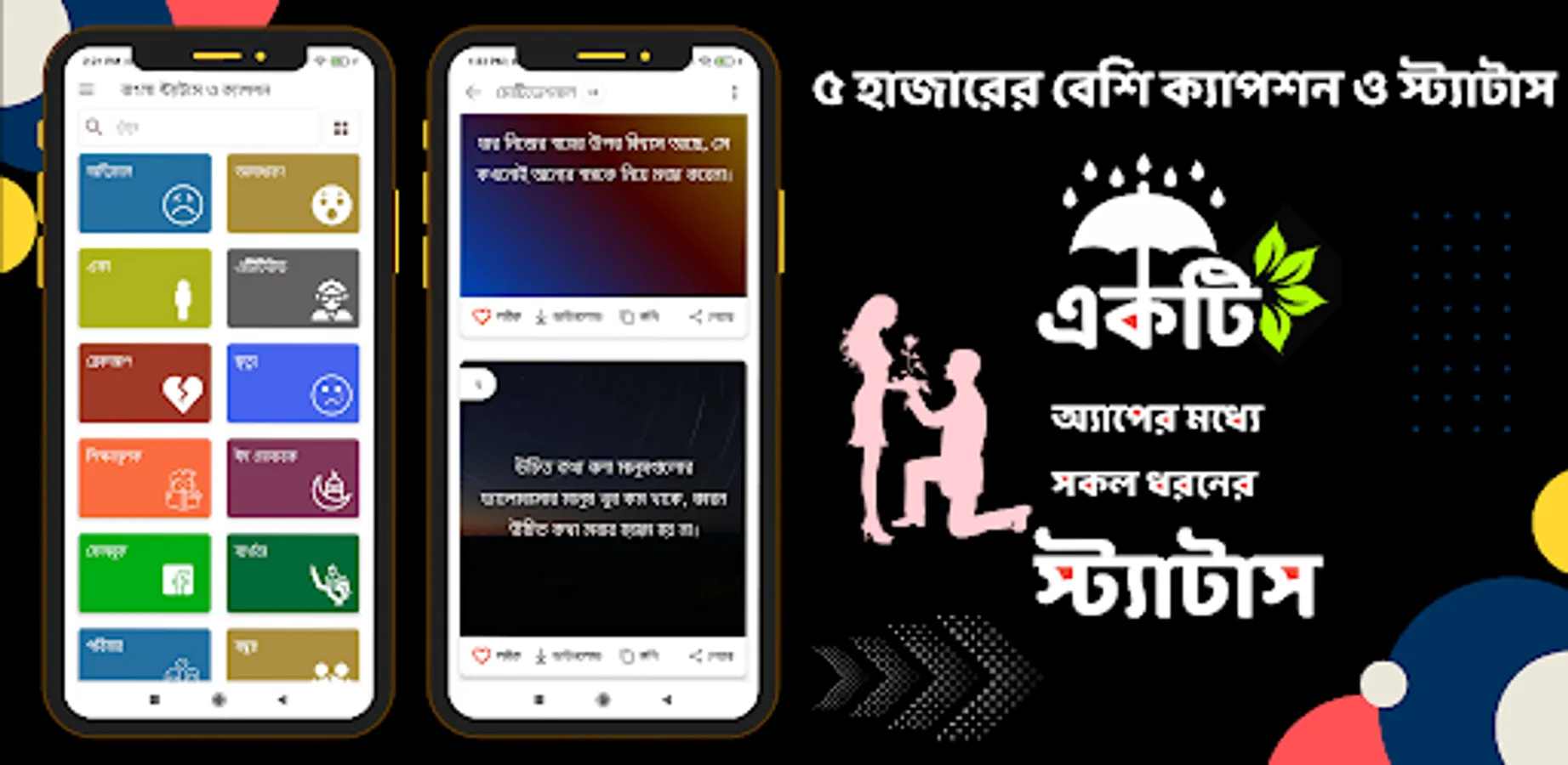 Facebook status and post caption help Explain the events of your life. This "app name" have sad status bangla/sad caption for fb also love status for bengali. Motivational status(অনুপ্রেরণামূলক বাংলা উক্তি) and inspiration picture caption share with family and friends. If you are sad share breakup sad status - heartbroken caption bangla on social media.There are funny status to make your mind happy. Very easy to use bangla photo caption/attitude status app with great user interface.