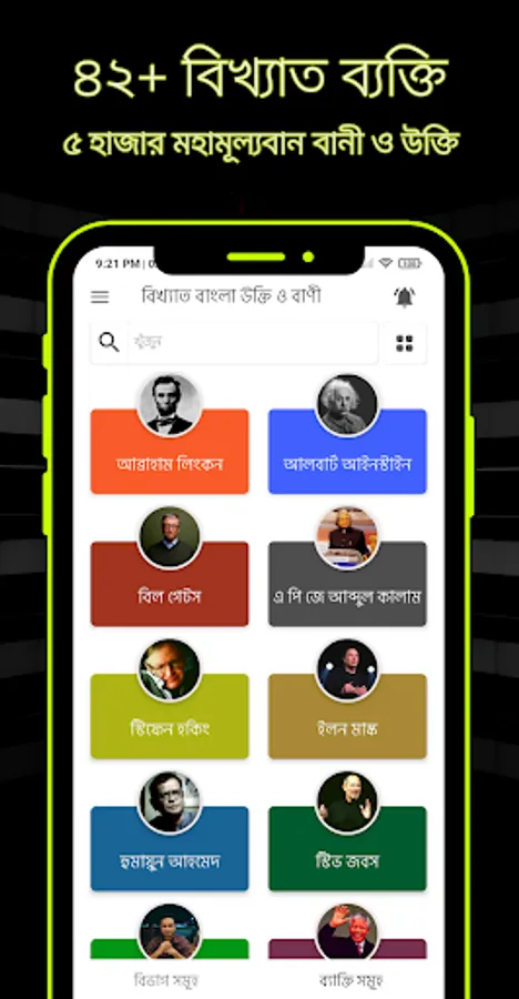 Life Changing Motivational status & inspirational Quotes in Bengali from famous people Ukti help success in life. Best positive Bangla Quotes, attitude status & photo caption for Facebook & WhatsApp 2022 have Bikkhato Monishider Bani. Share inspirational Bani Kotha / Famous Success Ukti with friend. This app has Bikkhato Bektider Bani / Quotes - Facebook Bangla status and picture caption also Kazi Nazrul Islam & Humayun Ahmed Ukti.