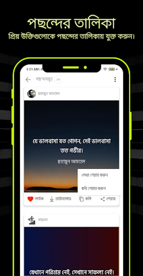 Beautiful Bengali Life quotes (Valobasar - Koster Ukti ) with pictures & life changing attitude motivational / funny status will make you happy. Bengali quotes with pictures of popular authors, captions on Instagram and bio for Facebook DP and famous person Ukti/Bani. Bangla attitude status and relationship quote with love / romantic SMS send you lover. On this app has Bangla Ukti or bikkhato baktir Bani - best quotes status. You can download quotes image and share on fb. Islamic Status and Quotes will motivate you.