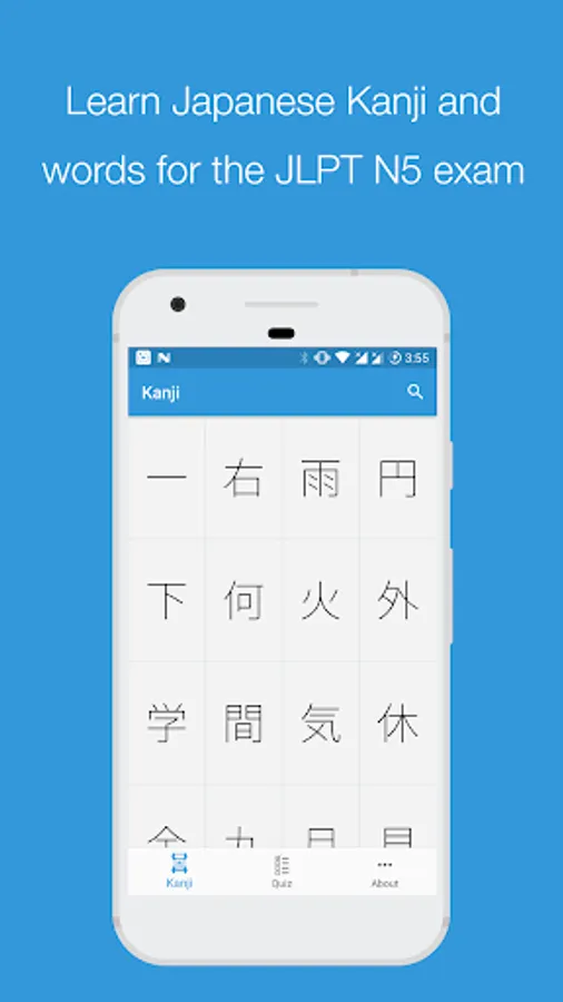 KANJI JLPT N5, existing also on iOS, will help you learn Japanese kanji and words (non-exhaustive list) for the JLPT N5 examination.