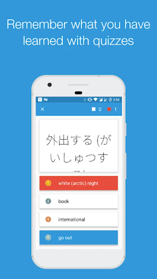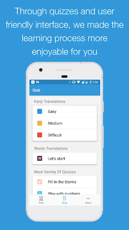 - Different kind of fun quizzes such as Fill in the blanks, Find the antonym, Play with numbers, Kanji, Words and even the possibility to create custom quizz.