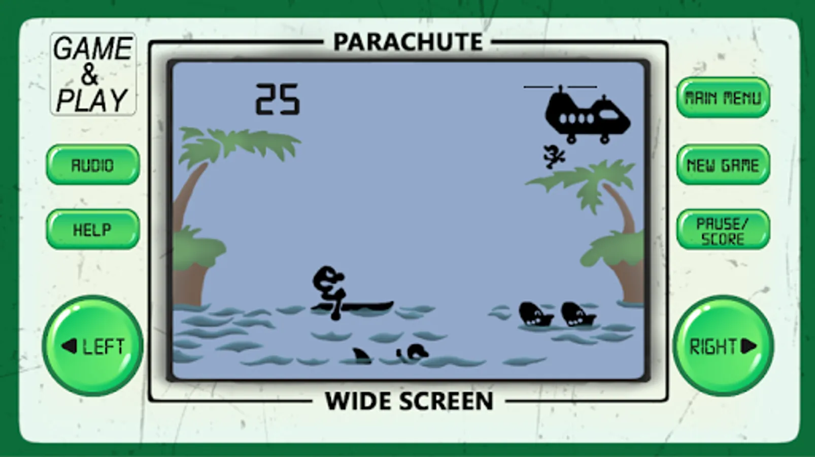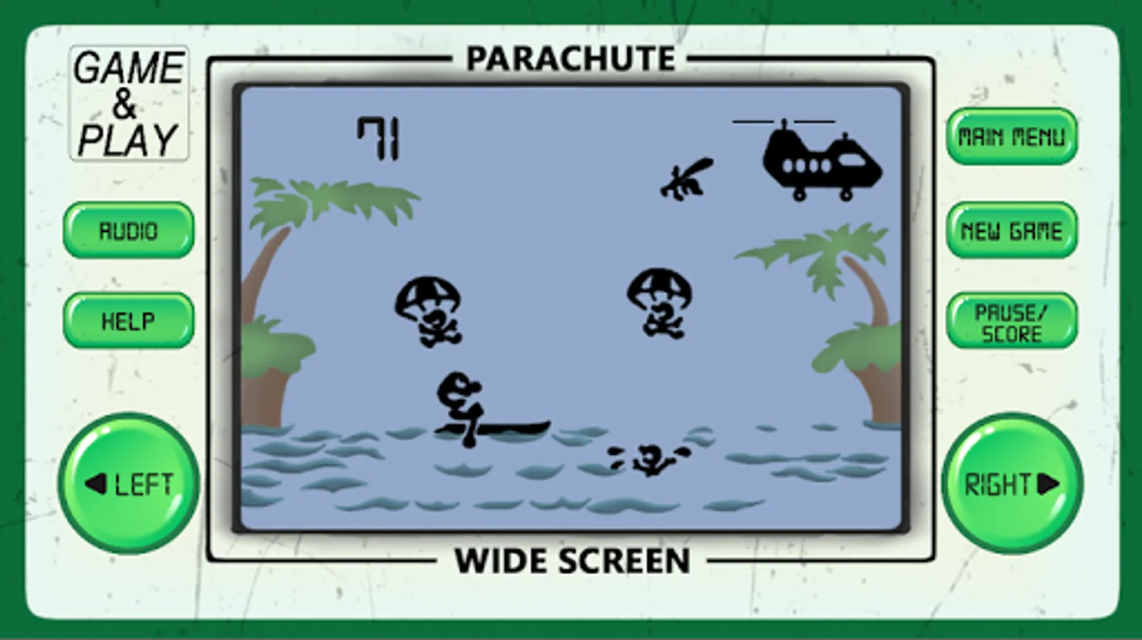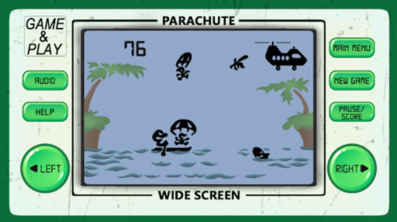 Parachute arcade game is an 80's arcade style game of retro classic arcade games from the 80's and 90's, developed to look and feel like LCD screen old-school electronic classic arcade games.