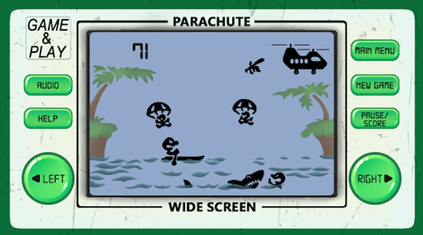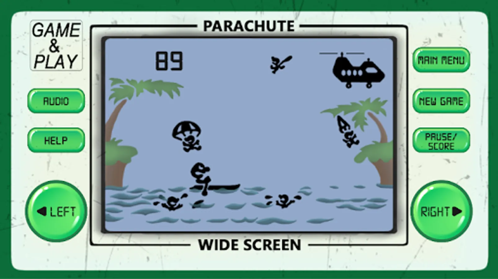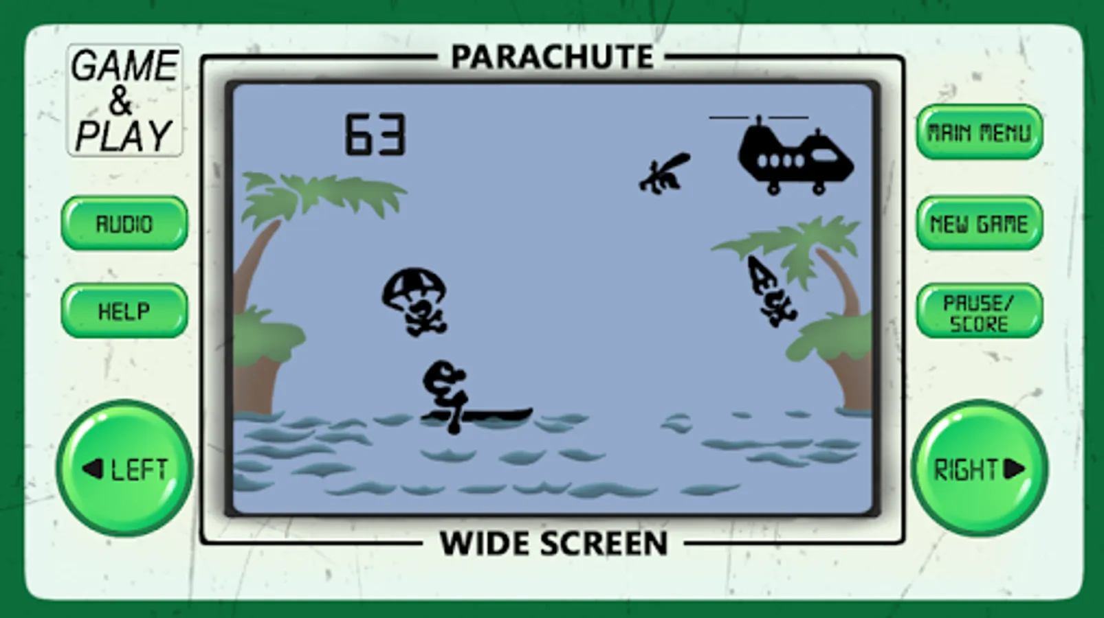 Parachute arcade game is an 80's arcade style game of retro classic arcade games from the 80's and 90's, developed to look and feel like LCD screen old-school electronic classic arcade games.
