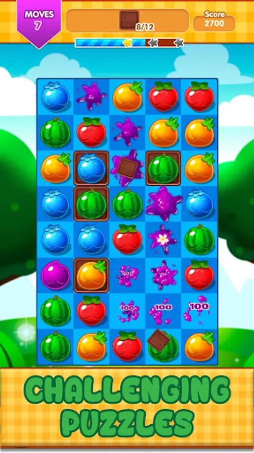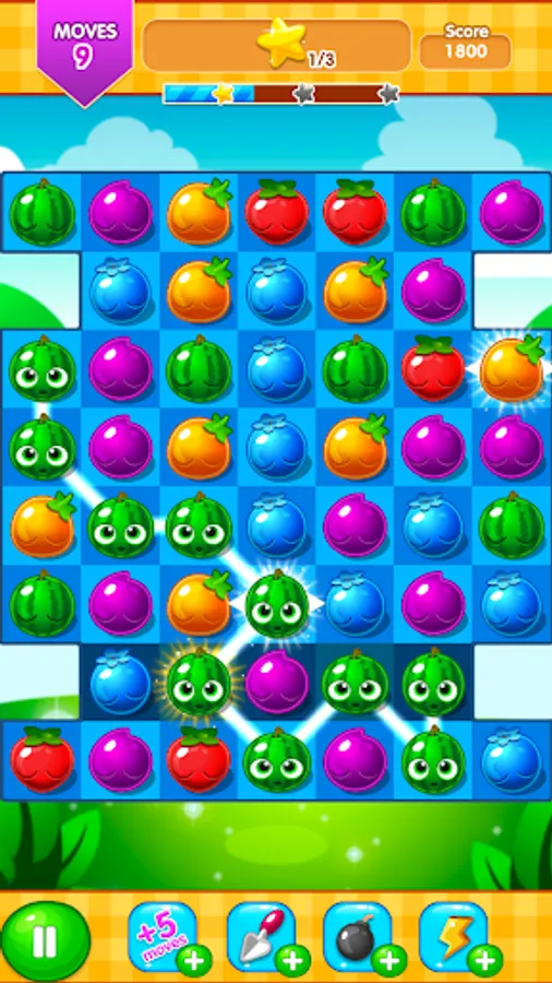 Locate long chains and start by tapping on a fruit and swiping across the screen onto other matching fruits to form a chain. Release finger to watch them explode.