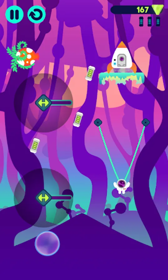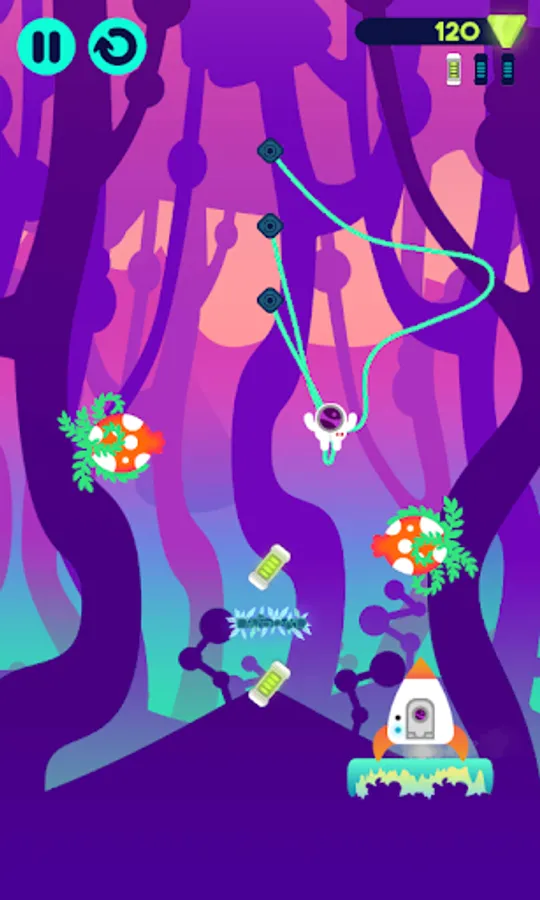 Swinging on vines through a dense alien jungle, cut through the rope to work your way to your ship while collecting fuel cells.