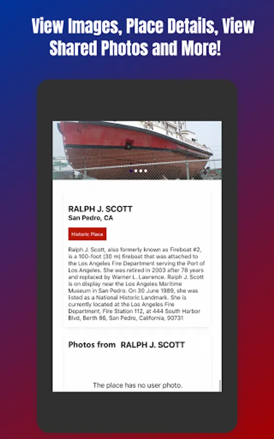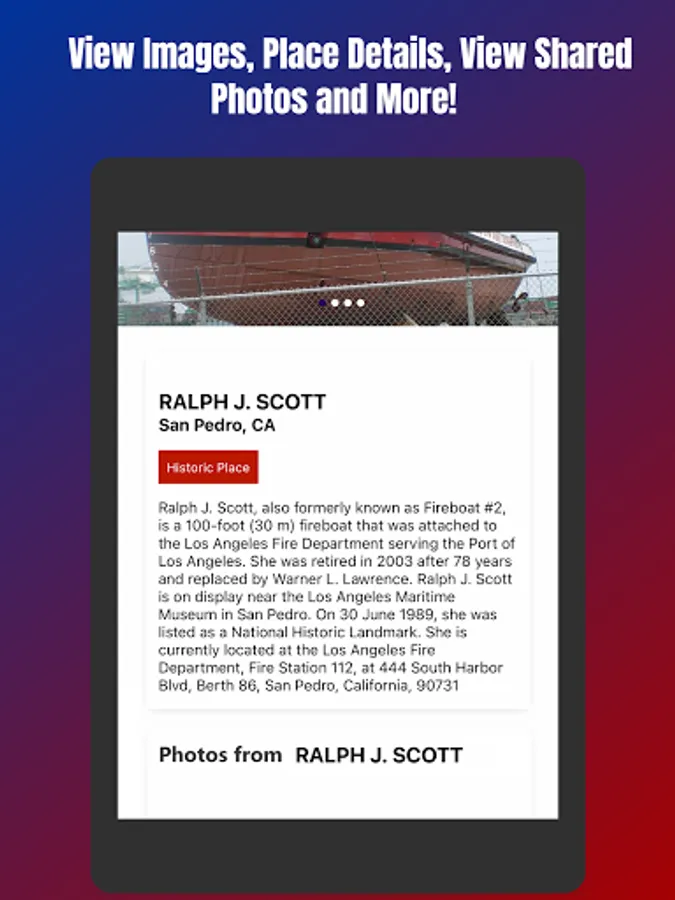 Complete with High Quality Images, Detailed Descriptions, and a list of always updating Location Amenities, the Historic Places & Landmarks app brings the best data available combined with meaningful social uploads from users aims to be the ONLY app you'll need for finding information and planning a destination based trip to Nationally Registered Historical Places and Landmarks in your Area and Beyond!