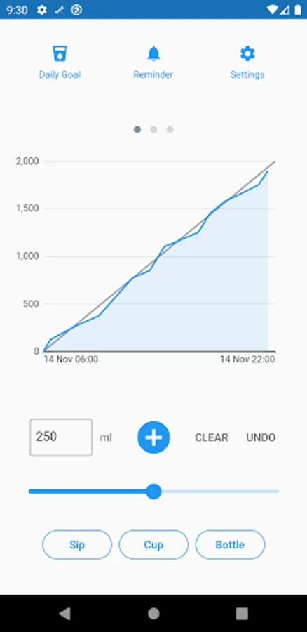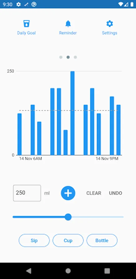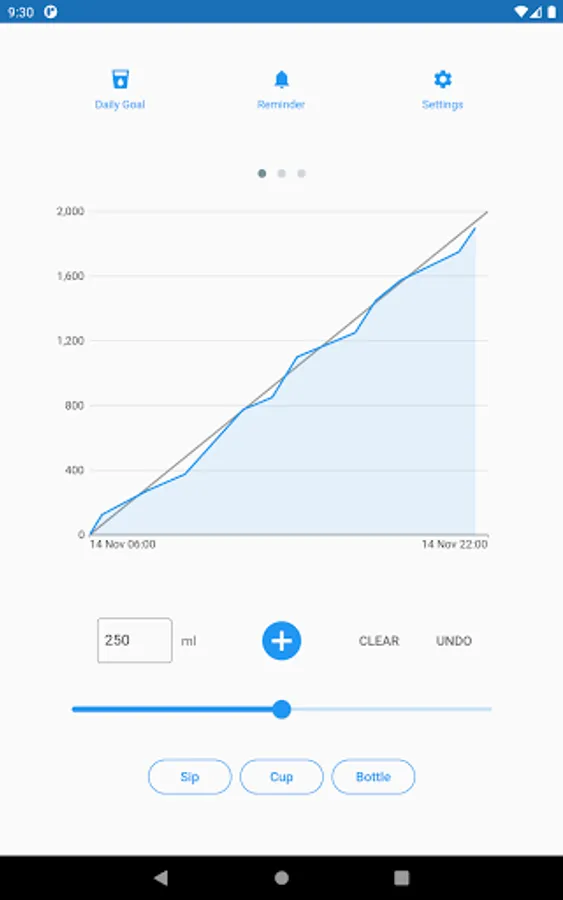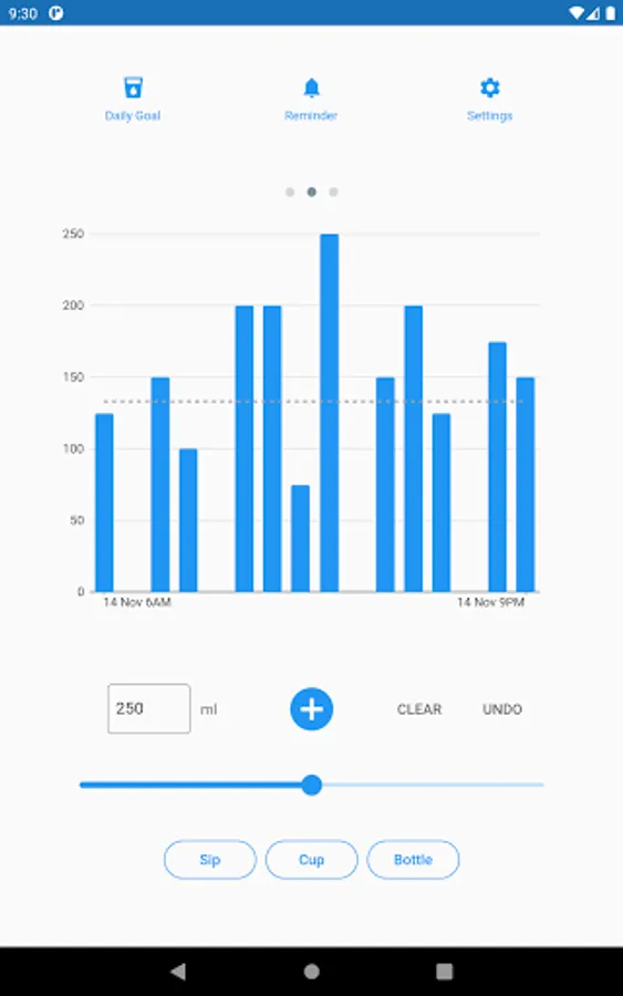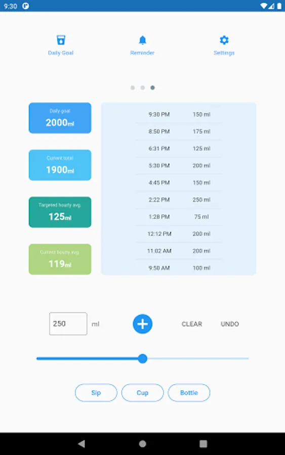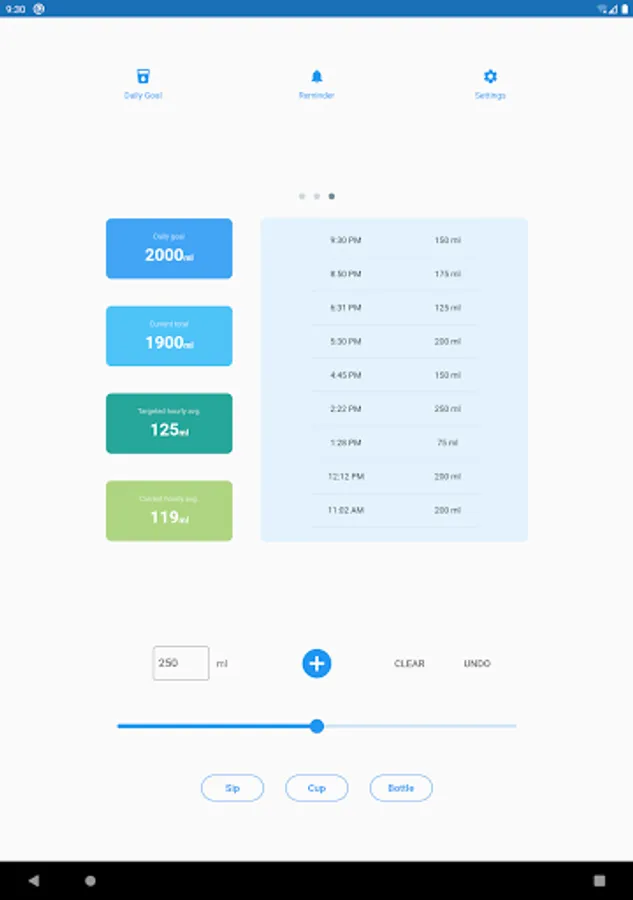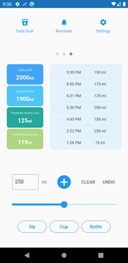 • Smart reminder only sends out notifications when logged water intake rate is below targeted hourly rate