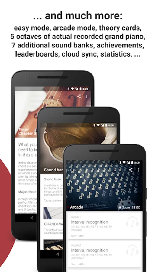• 11 drill types, 24 intervals, 36 chord types, chord inversions, 28 scale types, melodic dictations, chord progressions