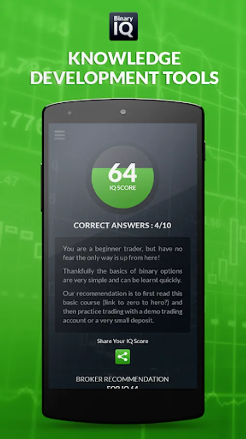 You've taken the quiz, are you a binary option guru that's ready to profit on every trade? Great! We're proud of you, use the apps social sharing feature to share your score with your friends. Challenge them to an IQ option quiz off and see who holds the highest Binary Option IQ!
