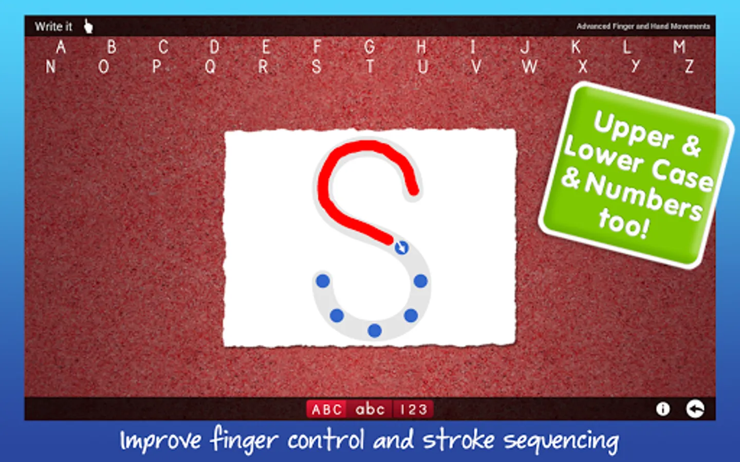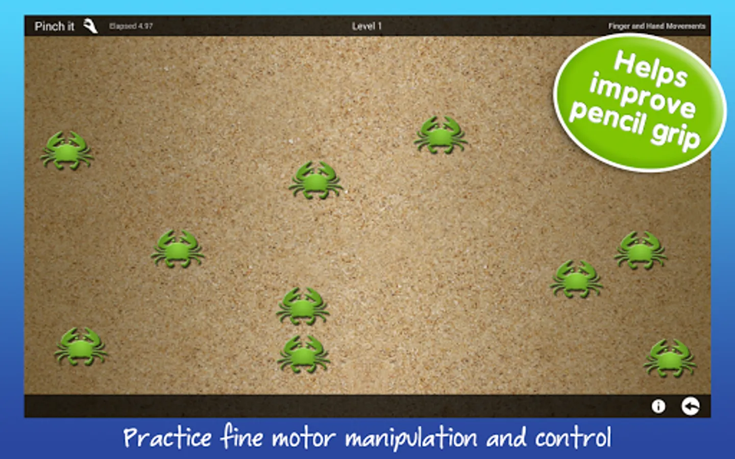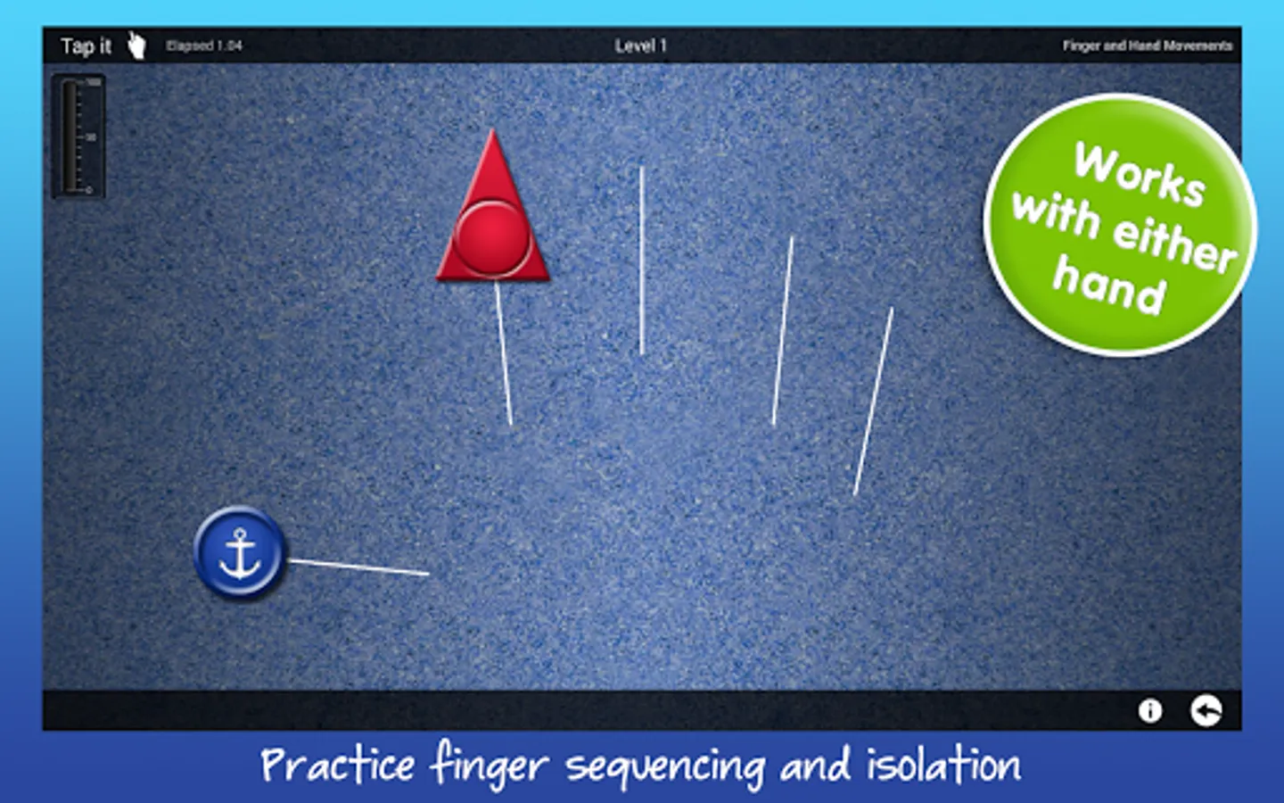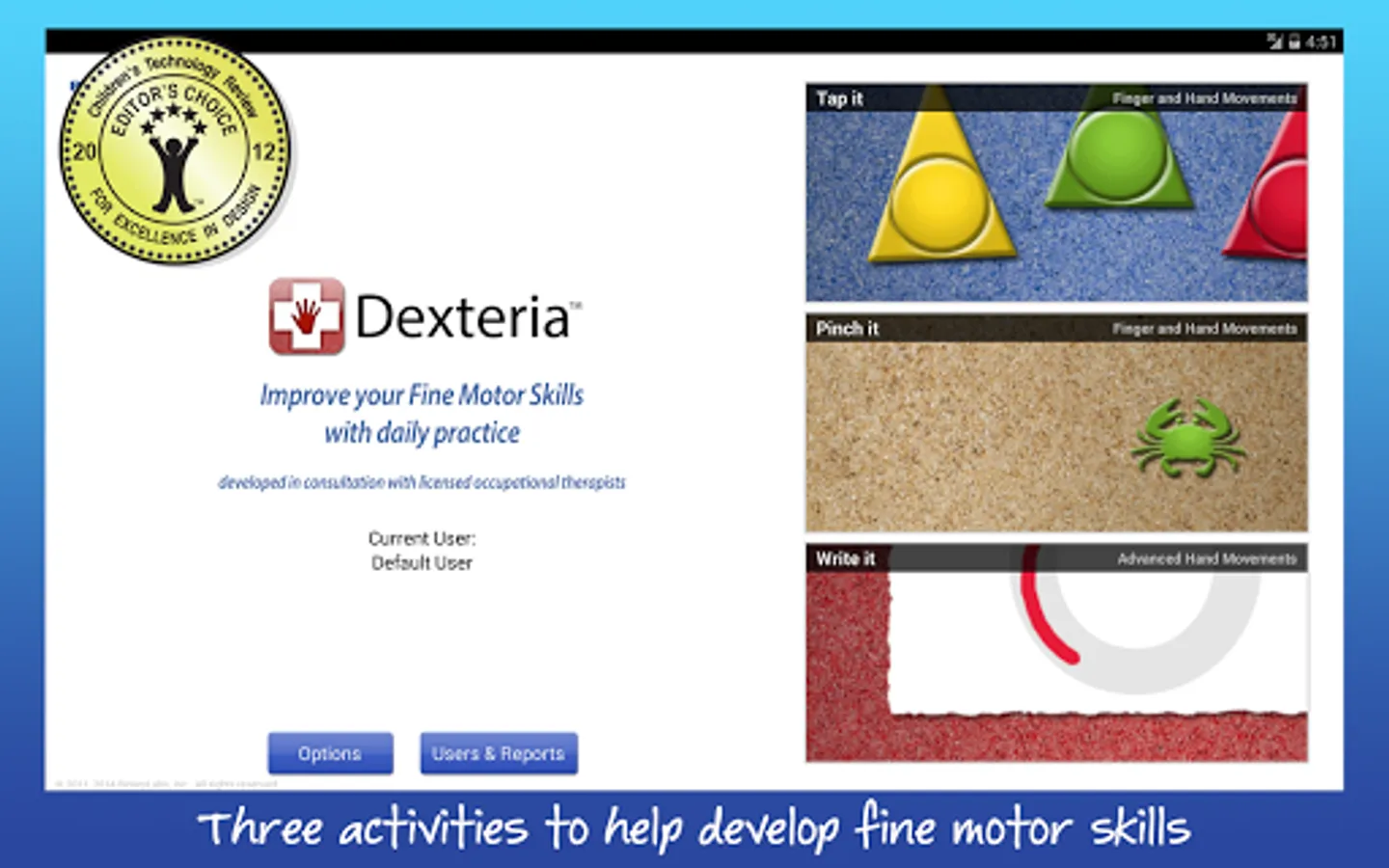 Dexteria’s unique hand and finger activities take full advantage of the multi-touch interface to help build strength, control, and dexterity.