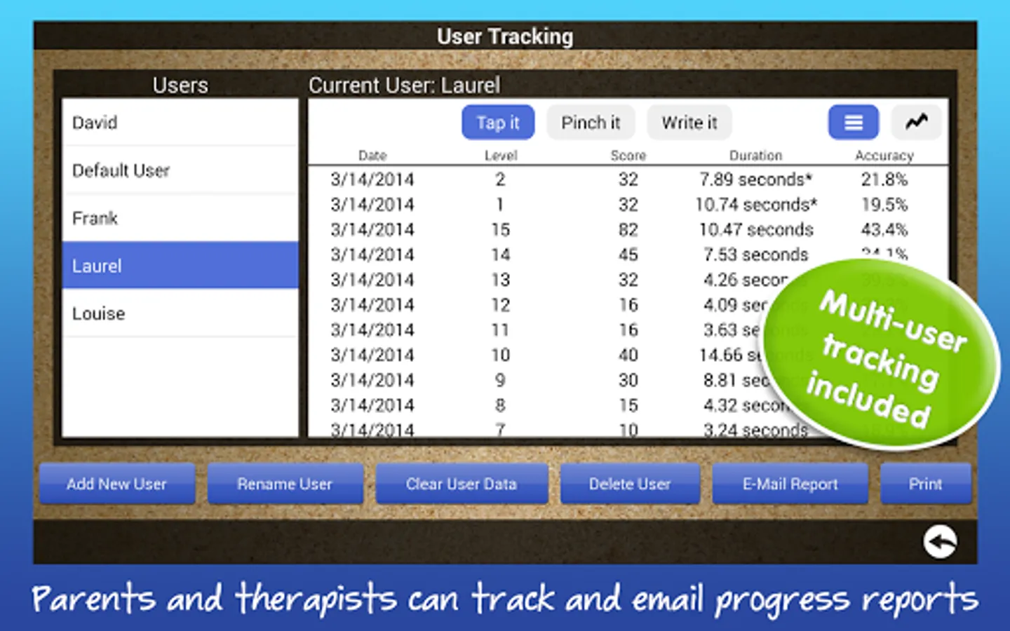 The automatic tracking and reporting feature makes it easy for patients and doctors to track progress. You can email the progress reports right from the app itself. This version also features graphing reports, so you can easily see progress over time.
