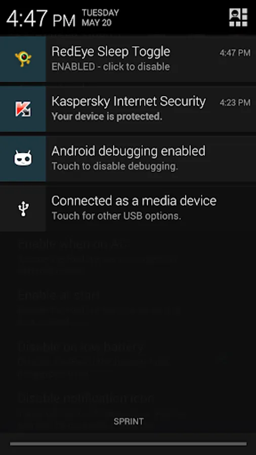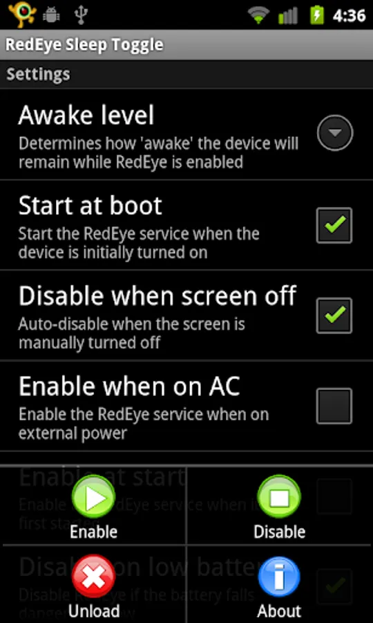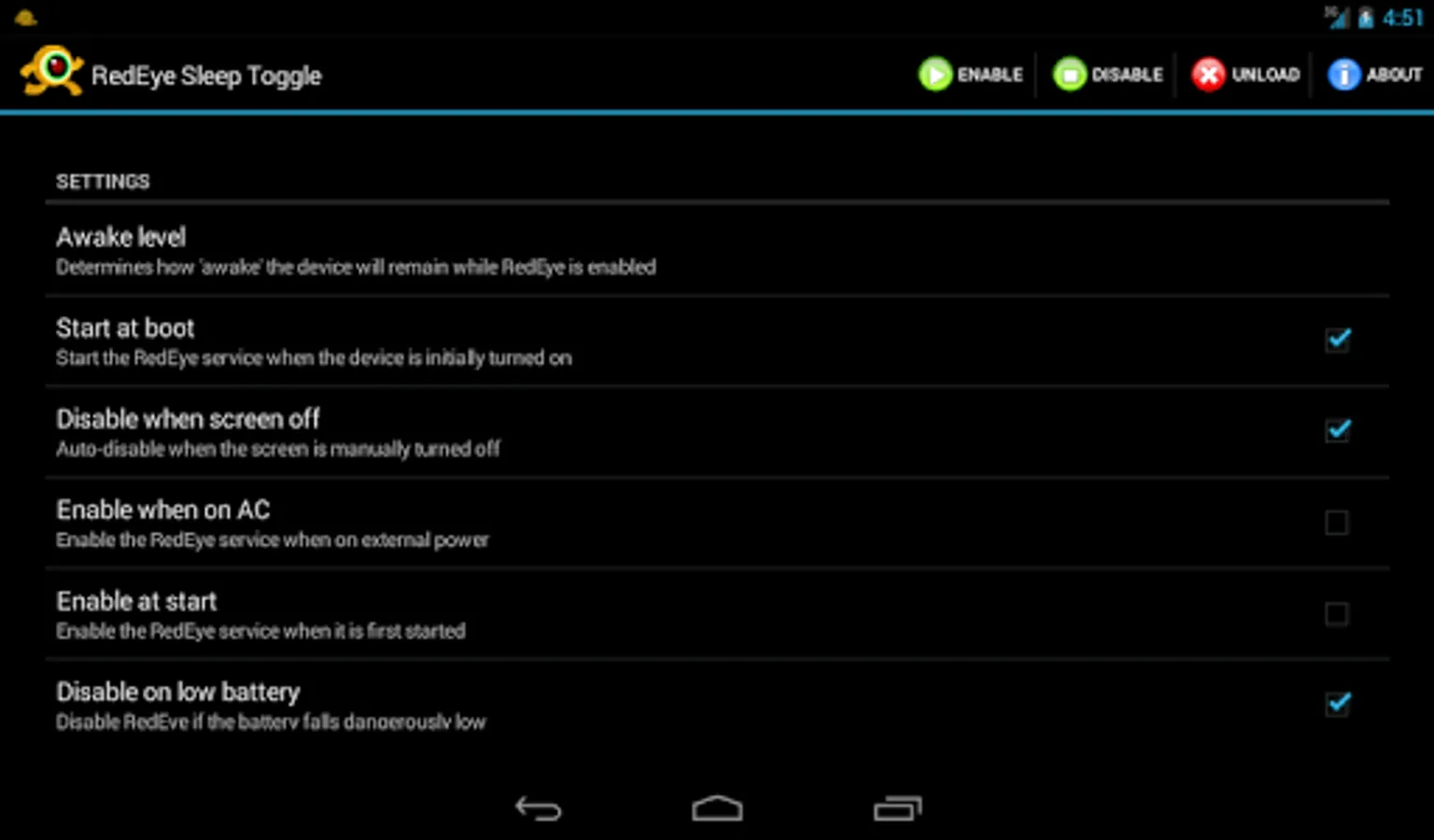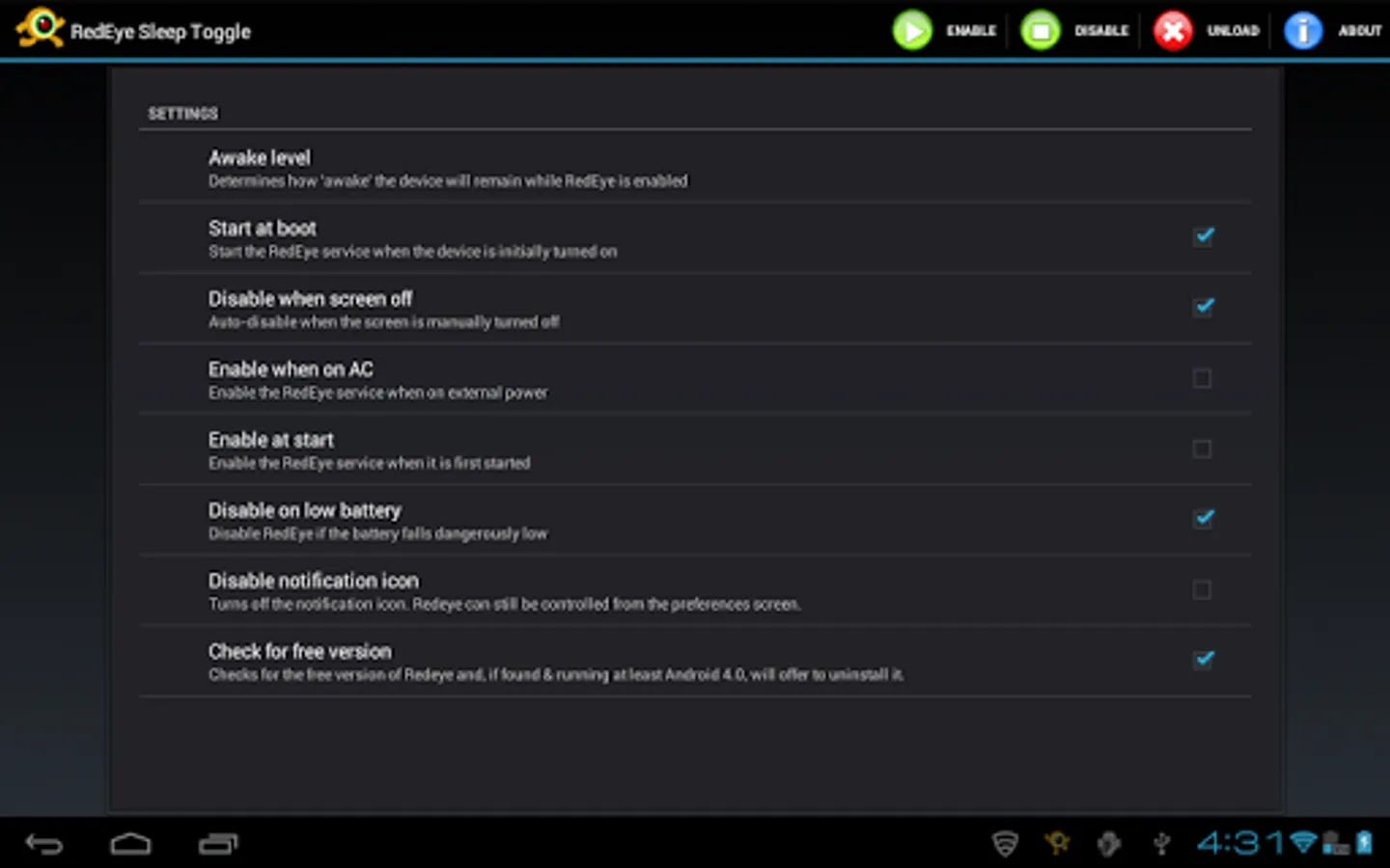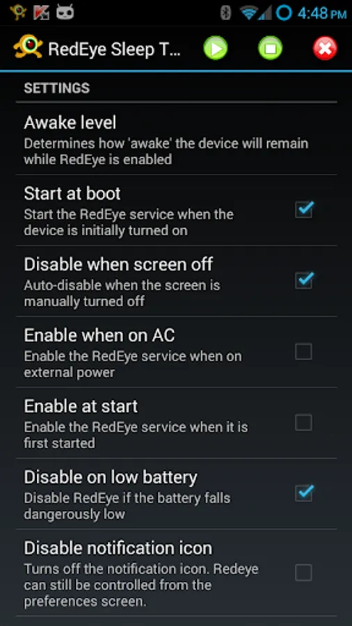 RedEye allows your phone or tablet to stay awake by preventing it from going into sleep mode regardless of whatever apps are also running. It allows you to quickly and easily turn on & off automatic sleep mode without having to dig through the configuration menus.