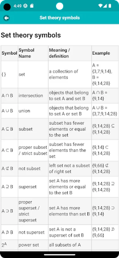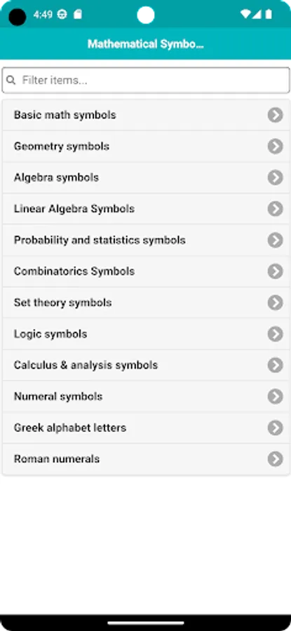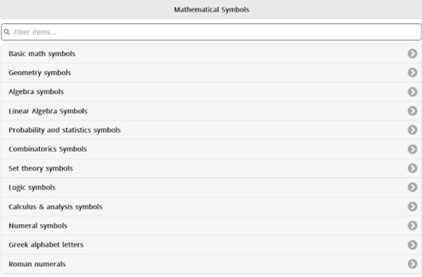 Math, Algebra, Geometry, Calculus, Alphabet, Probability and statistics symbols for students. In this app, you will get these math informations: