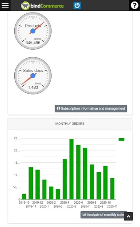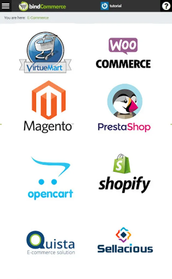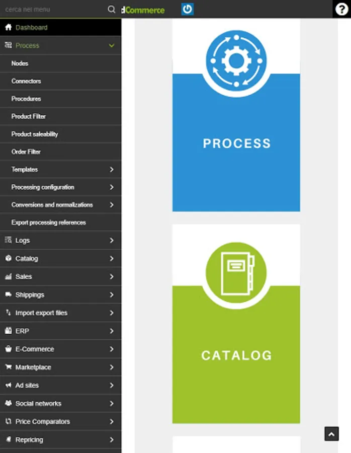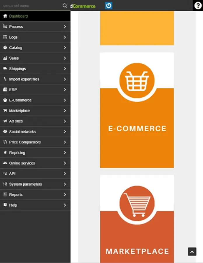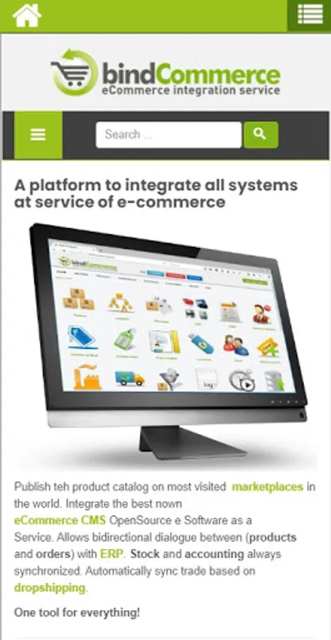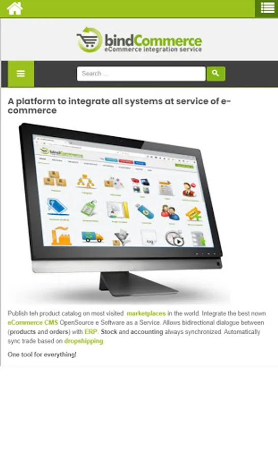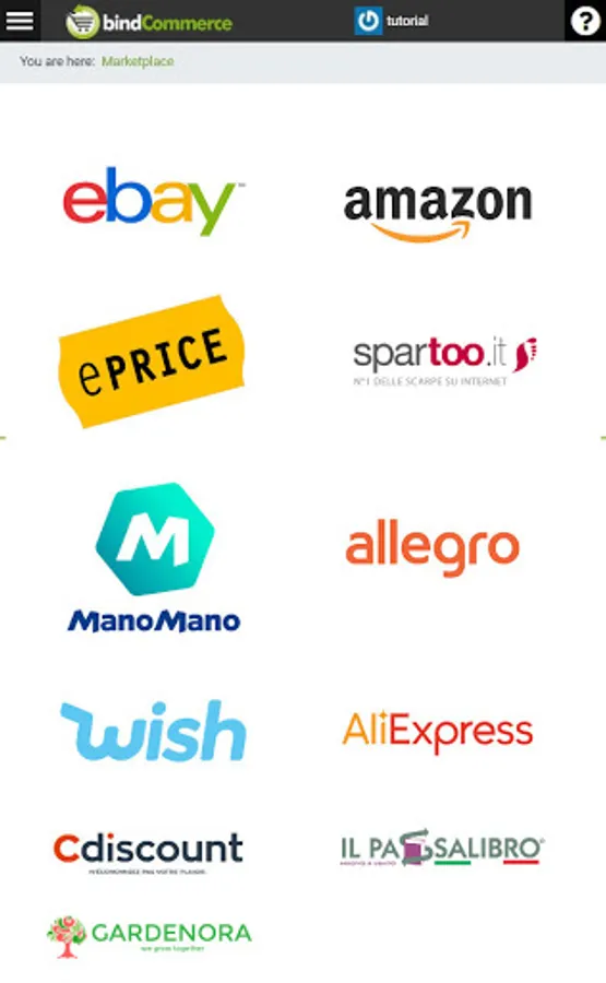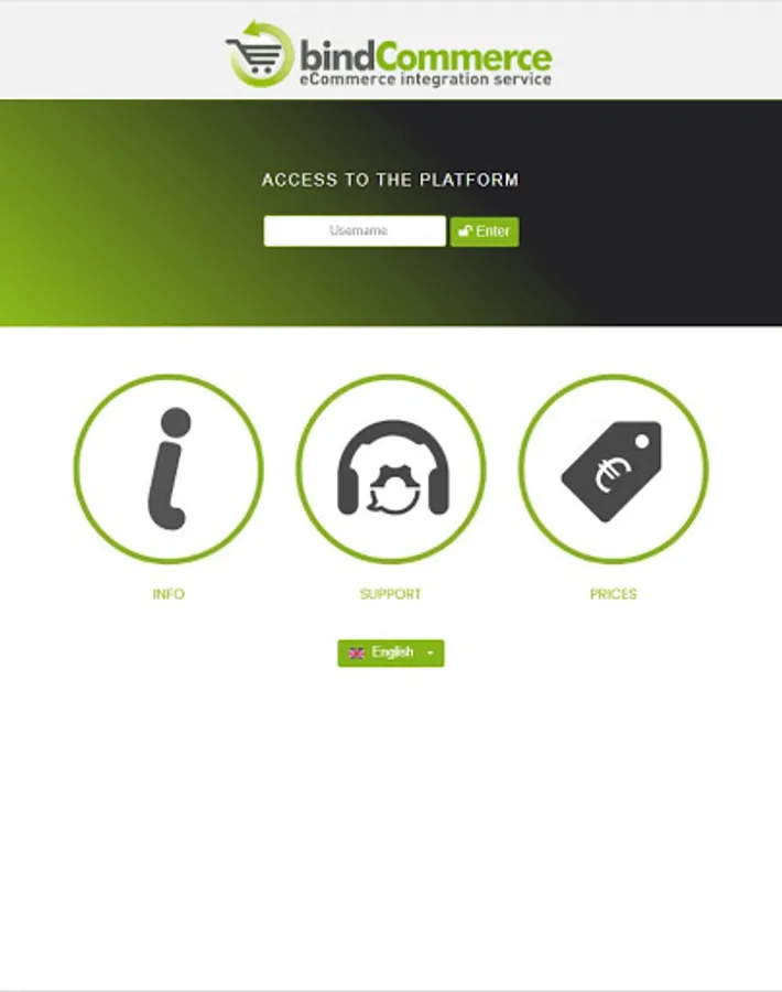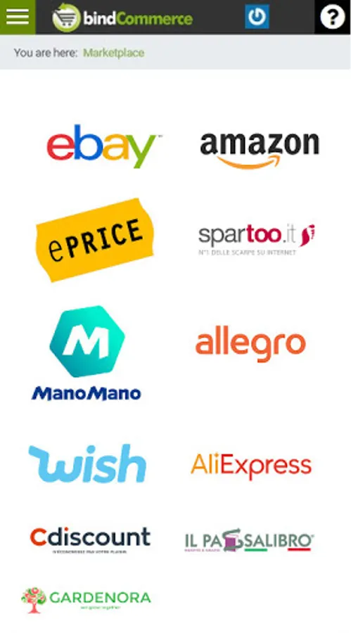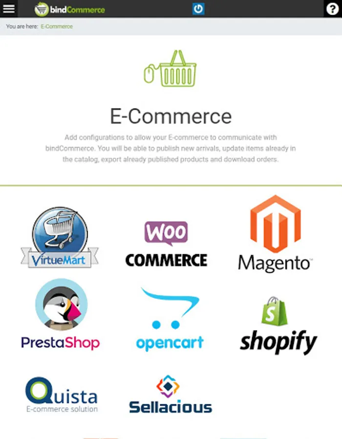 The bindCommerce system is accessible to users through a web based interface that allows you to view and modify your data (eg products, categories, orders) and manage the movement of the same to and from ERPs (such as QuickBooks and the italian Danea Easyfatt, Giobby, Intersoft Starty ERP, LYNFA, ALYANTE, Bman, Mycrsoft Dynamics NAV, Passepartout Mexal, SAP ERP, Fatture in Cloud, Zucchetti AHR, Eversell, Bemall, e / Empresa, NTS Business, Magic Store, Aurum), e-commerce platforms ( VirtueMart, WooCommerce, Magento, Prestashop, Sellacious, OpenCart, Shopify, Quista), marketplace (eBay, Amazon, Amazon Business, ePrice, Spartoo, ManoMano, Allegro, Wish, cDiscount, AliExpress), ad sites (like Kijiji), social networks (such as Facebook Catalog) and price comparators (such as Google Shopping and Trovaprezzo).