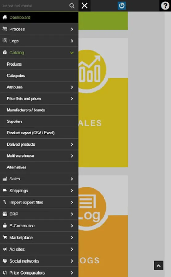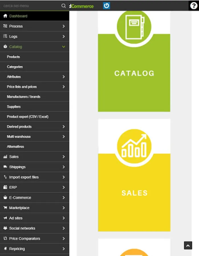 The CATALOG contains the management of products, categories, attributes, price lists and related prices, producers, suppliers and alternatives (thanks to which it is also possible to manage multilingual). It is also possible to use the multiple export file options made available and set the derivative products with the related derivation rules.
