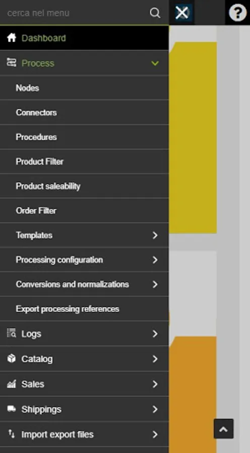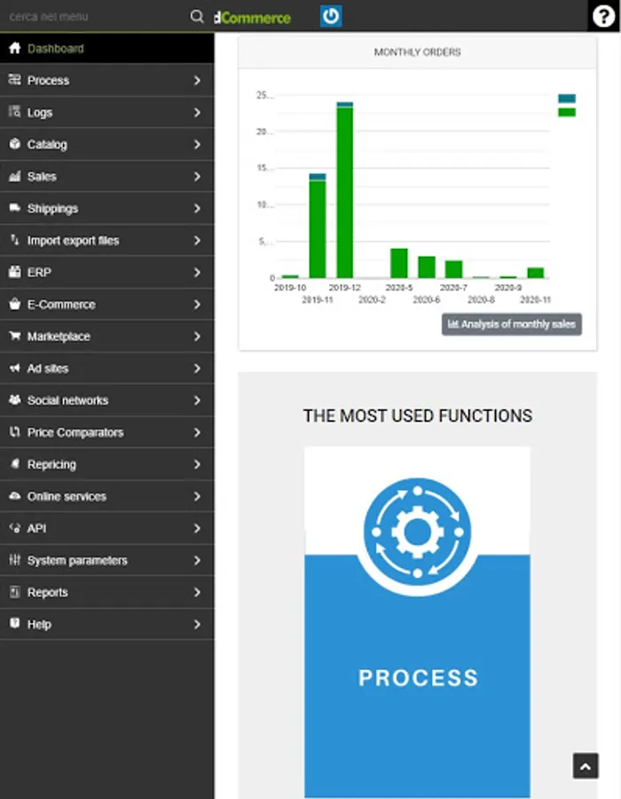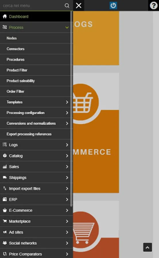 ECOMMERCE groups all the items relating to the processes that can be executed from and to the integrated eCommerce platforms, divided by type of CMS. For each eCommerce platform there are the related specific items.