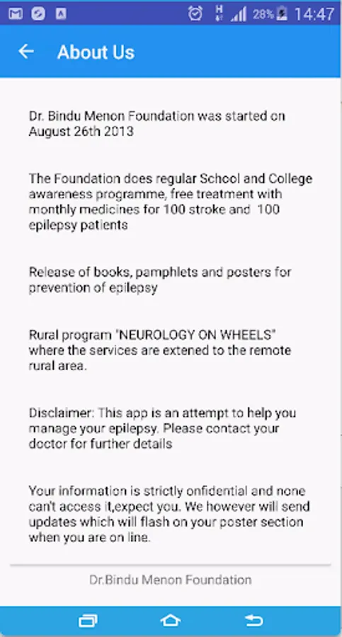 EPILEPSY HELP APP is to help epilepsy patients to organise and upload their medical data, keep medicine alarm and seizure alert,track appointment schedule and to know about epilepsy.