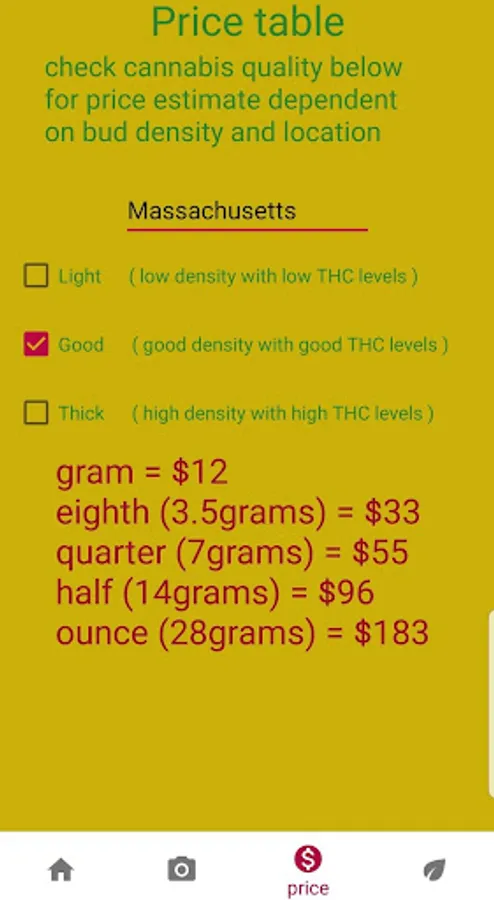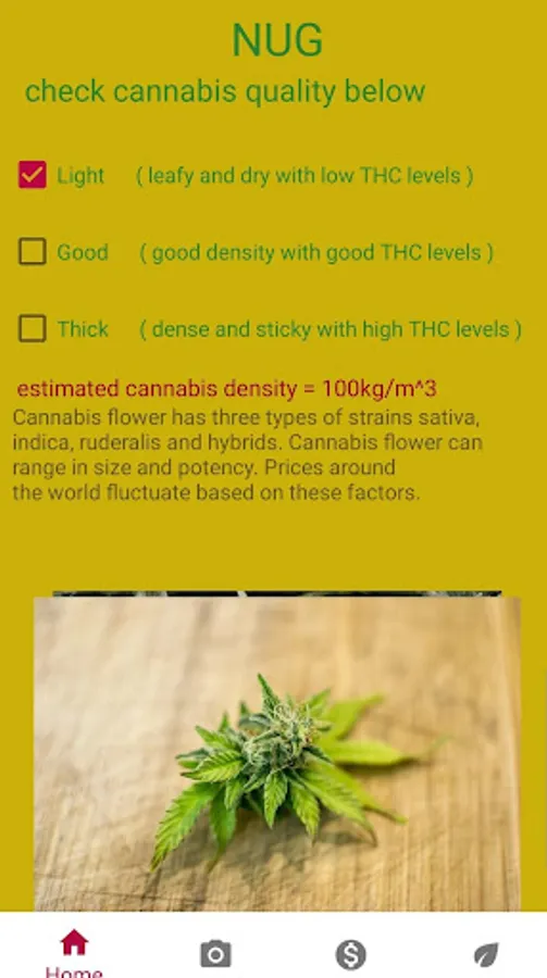 The Nug application allows users to select a cannabis flower or ground cannabis to weigh with their phone camera using variable density and volume equations. The app also uses data from every country to estimate cannabis prices based on quality and location.