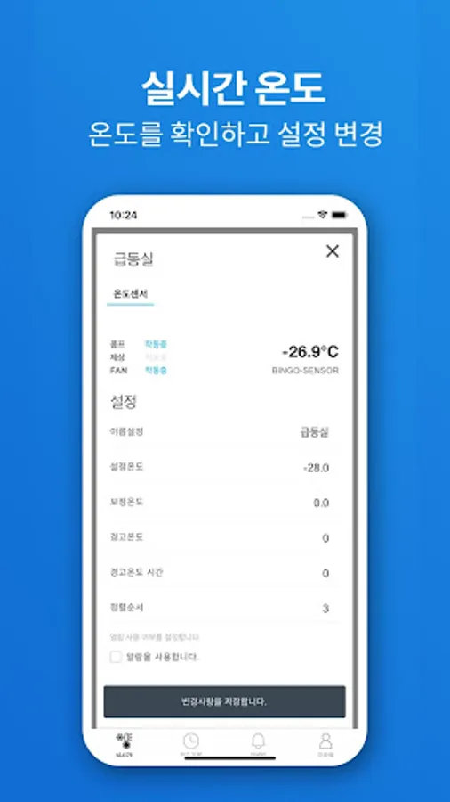온도 변경, 보정온도, 온도 알림, 저압,고압,유압등 빙고를 통해 실시간으로 변경 및 상태를