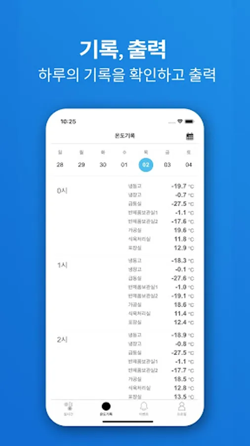 시간 설정, 하루단위의 저온창고의 온도, 압력의 변화를 그래프로 확인 가능하며 다운로드를 제공합니다.