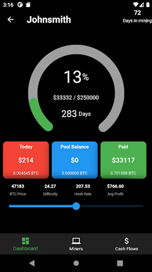 A simple tool for BTC miners to track their ROI with F2Pool. Users just need to use their F2Pool account to start the app and see the revenue against the target they set. Users are also able to see the income change with respect to BTC price change.