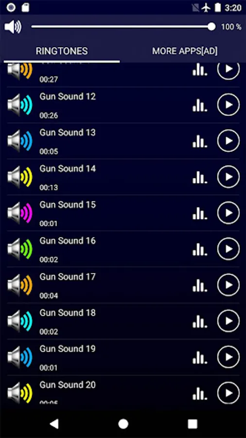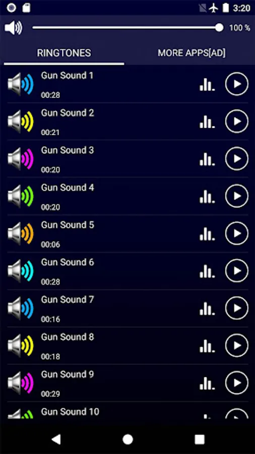 Open this free gun sound ringtones & wallpapers application, you can press the " play " button to listen to the MP3 ringtones.