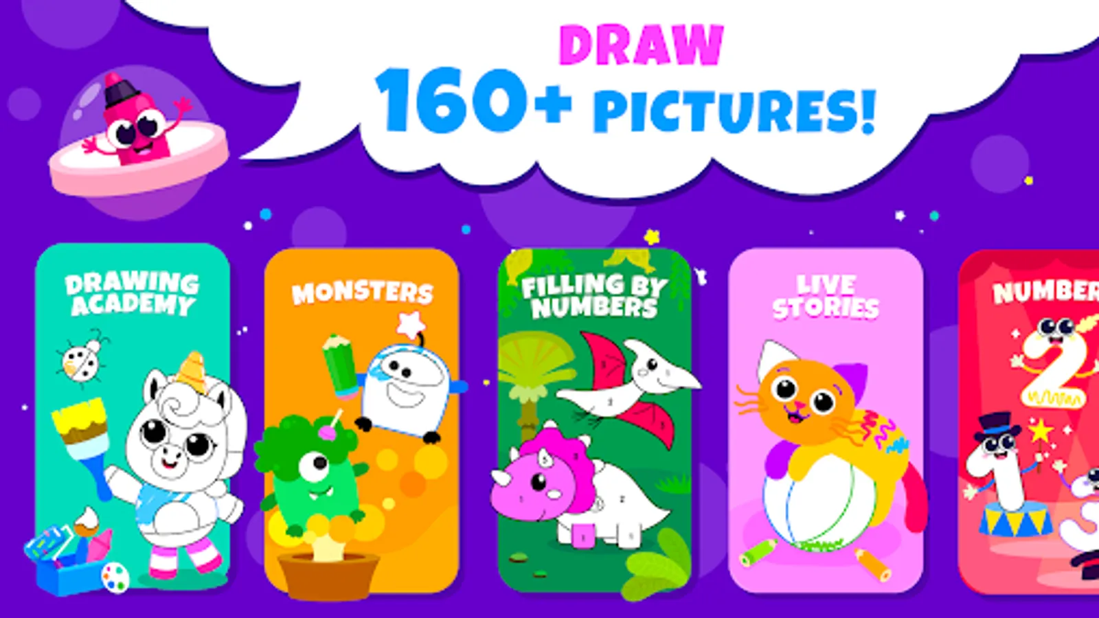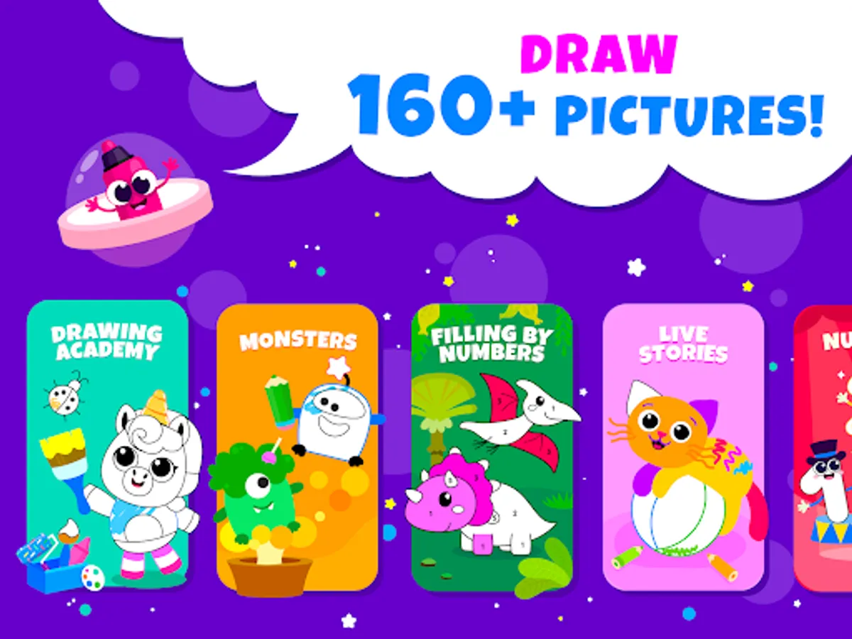 Try brushes, markers, stickers and filling.π¨βπ©βπ§βπ¦ Kids academy is a coloring app for kids.π¨βπ©βπ¦ It`s full of surprises for toddler drawing!π§ While playing your childβs drawing and cognitive abilities will improve. Updates with new pictures every week. Drawing plays an important role in pre-schoolers right-brain development. There is a great amount of 2 year old games and games for the elder children. Coloring apps for kids were created as a support on the way of pre-school education.