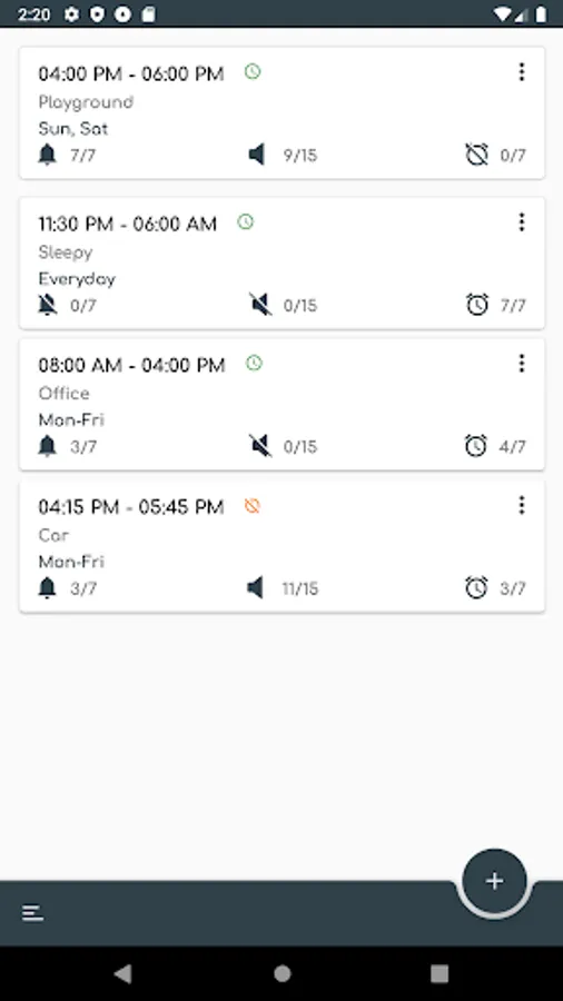 It works like Nokia, Blackberry or Ericsson old sound managers with scheduling support. You can set to Silent just for 10 minutes (or whatever time you want). Scheduler feature to automatically change profiles at given times (for example, activate Night at 12:00am, Normal at 08:00am, or activate Office at 09:00am and Normal at 05:00 pm for Monday to Friday).