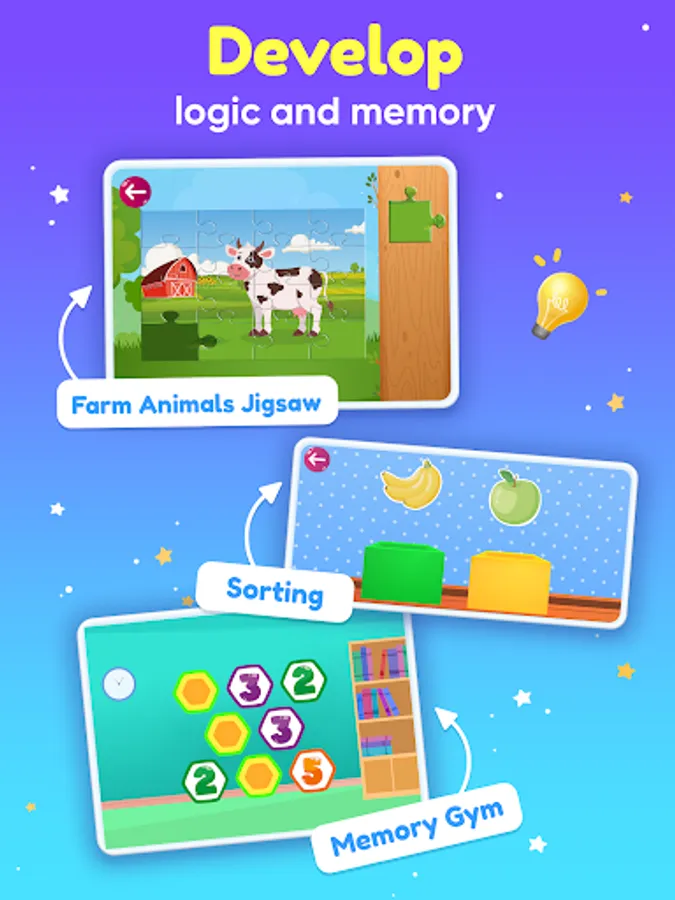 Your children have to put together puzzle pieces to reveal the picture. Your kids can choose from multiple sets of pictures. They love dinosaur & farm games for toddlers 2+. Each set contains ten or more pictures, each in several difficulty levels.