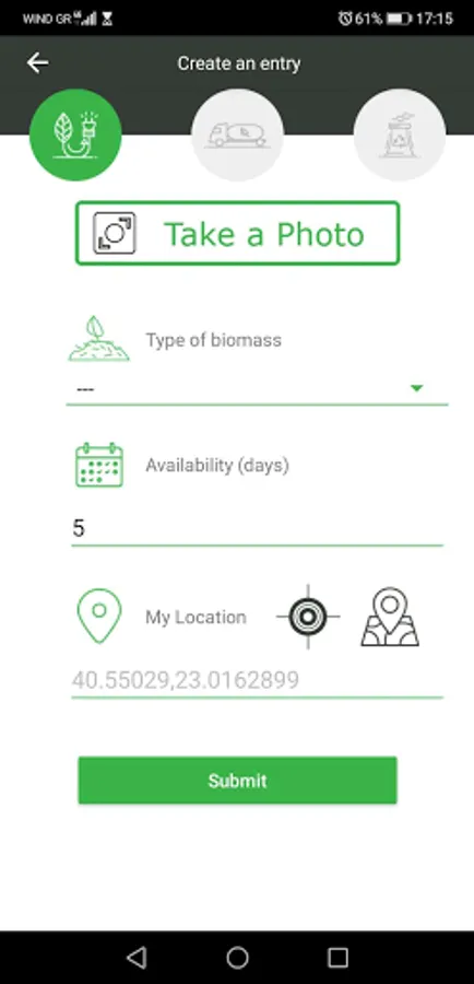 3. Fill the data of the new entry (area, type of biomass, availability).