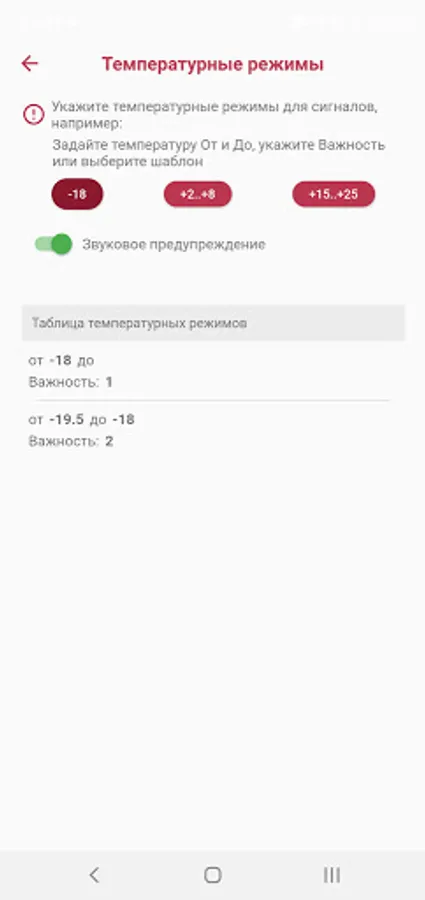 When the temperature approaches the boundaries of the set temperature range, an audible warning is displayed about the need to urgently take measures to prevent a violation of the temperature regime.
