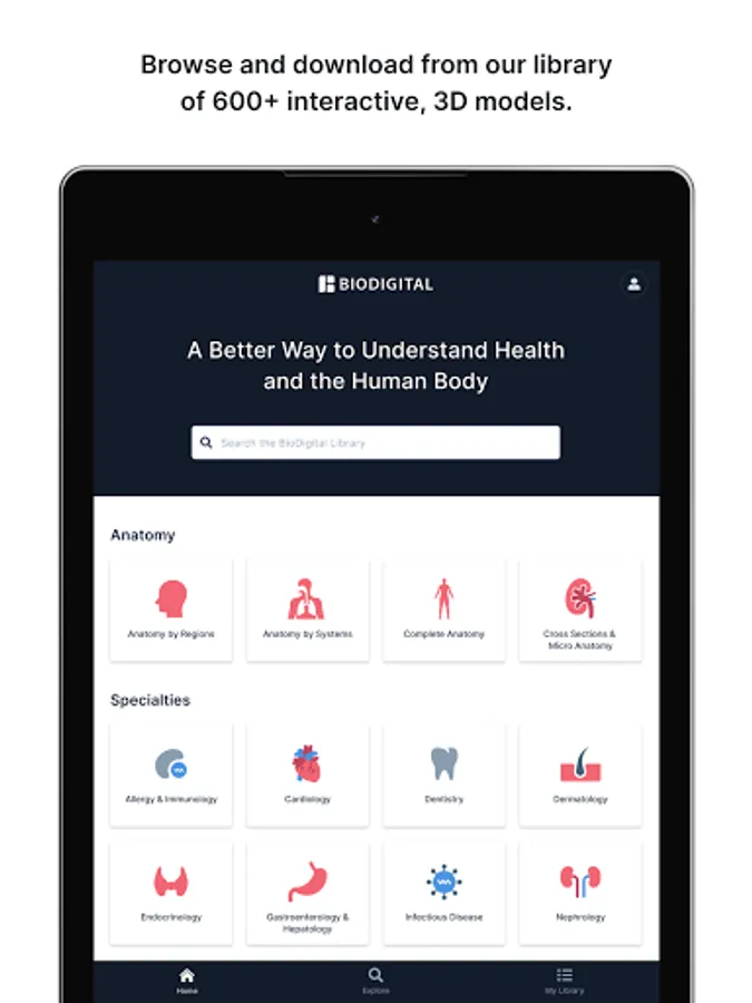 Our Human Library contains over 700 3D anatomy models, and is the most comprehensive, scientifically-accurate, and widely-used virtual model of the human body ever assembled. Perfect for learning anatomy and enhancing health literacy, people around the world are using the BioDigital Human to learn and educate on anatomy, physiology, treatments, and health conditions such as cancer, heart disease, injuries and more. The BioDigital Human online application, included in your registration and available at human.biodigital.com, empowers you to create your own custom 3D models to visualize anatomy and the inner workings of the human body.