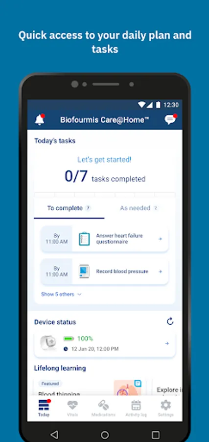The Biofourmis Care@Home™ patient-facing app is designed to improve patient engagement, display vital signs, and enable communication between patients and the care team. When the patient or clinician has connected the application to connected devices via Bluetooth, the outputs from these connected devices will automatically be displayed in the mobile app.