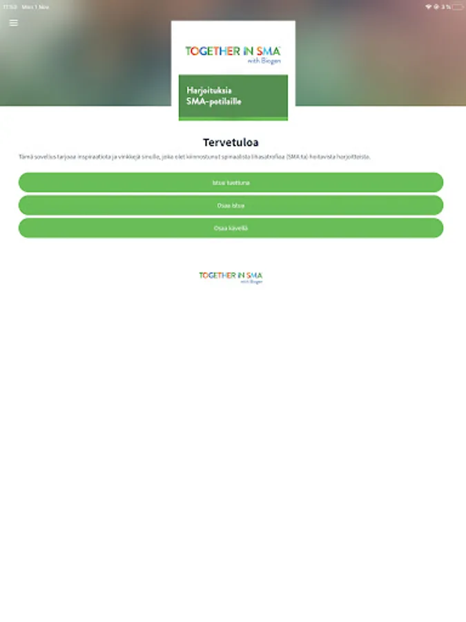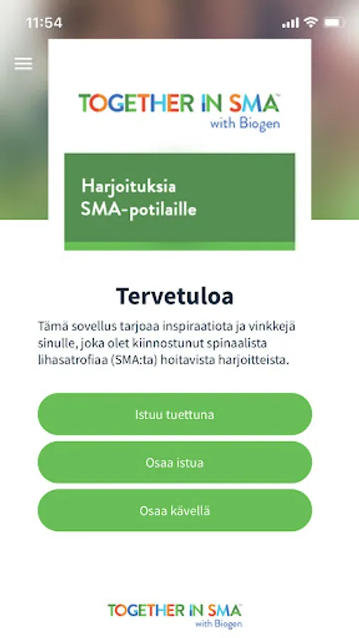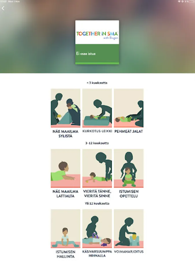 Tämän sovelluksen avulla haluamme tarjota inspiraatioita ja vinkkejä sinulle, jota kiinostavat neuromuskulaarista spinaalista lihasatrofiaa (SMA) hoitava harjoittelu. Pyrimme tavoittamaan sinut, jos olet SMA-lapsen vanhempi tai itse SMA-sairas, sekä myös muita SMA-potilaiden harjoittelussa mukana olevia ihmisiä.