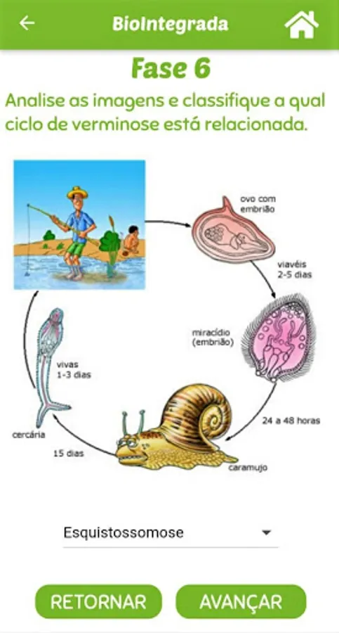 It consists of eight phases, with the aim of correctly analyzing and relating the structures and moving on to the next challenge. Phases 1 to 5 are related to human morphology and deal with the hierarchy of life, from the microscopic to the macroscopic level: cells - tissues - organs - systems - organism. Phase 6 refers to some cycles of verminosis that has the human being as a host and shows the integration of this organism in the environment in which it is inserted. Phase 7, on the other hand, continues the hierarchy of life at an ecological level: population - community - ecosystem - biosphere. Ending in phase 8 with the completion of a questionnaire, the purpose of which is to encourage reflection on our actions in everyday situations.