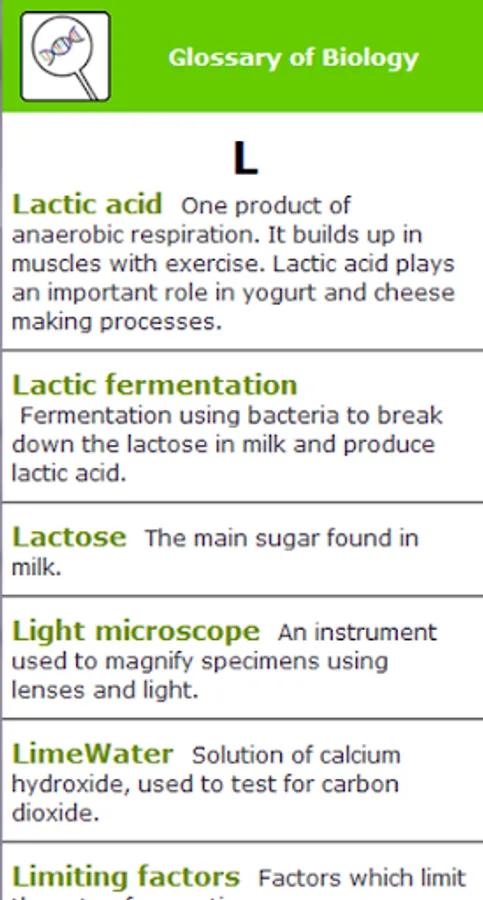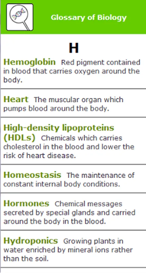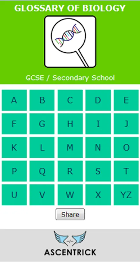 A glossary of secondary school Biology terms. A useful and handy reference for GCSE students, or equivalent. Check any definition of scientific terms in few clicks. Easy to use interface and user friendly lay out allows easy lookup. The share button allows easy share with popular social applications e.g. facebook, whatsapp, twitter etc.