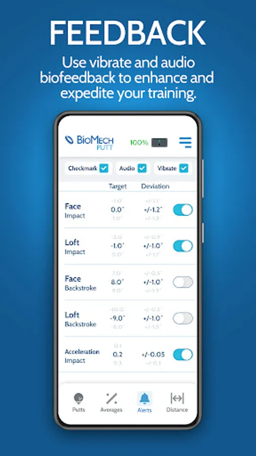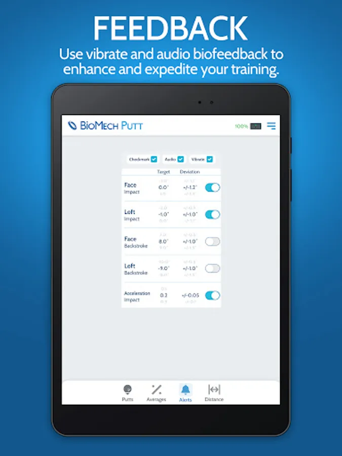 What’s so special about visual, audio and haptic feedback? BioMech uses these physiological mechanisms to expedite and enhance your practice experience and make the right motions more repeatable. The more senses you engage in real time, the faster and more likely you are to correct and improve your putting stroke and make that new pattern permanent. Plus, the audio and haptics provide a hands-free putting experience.