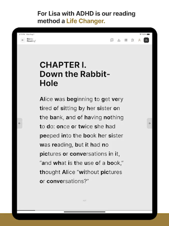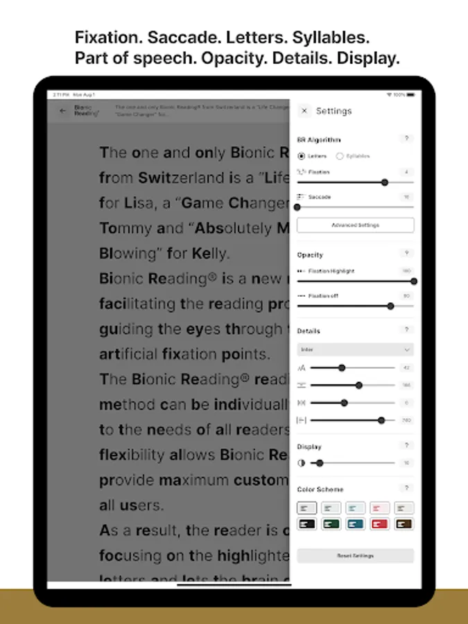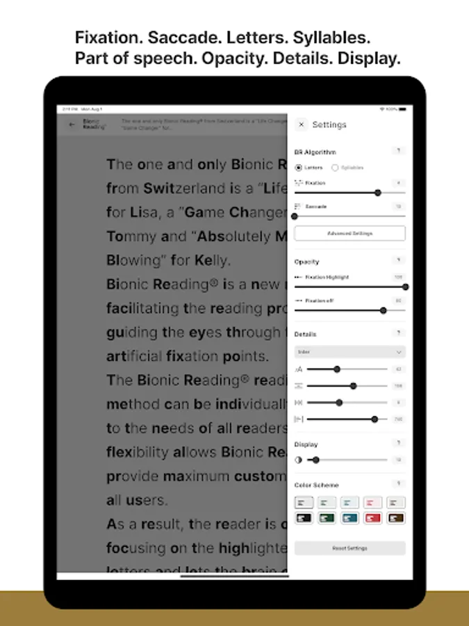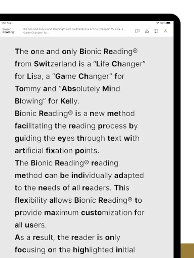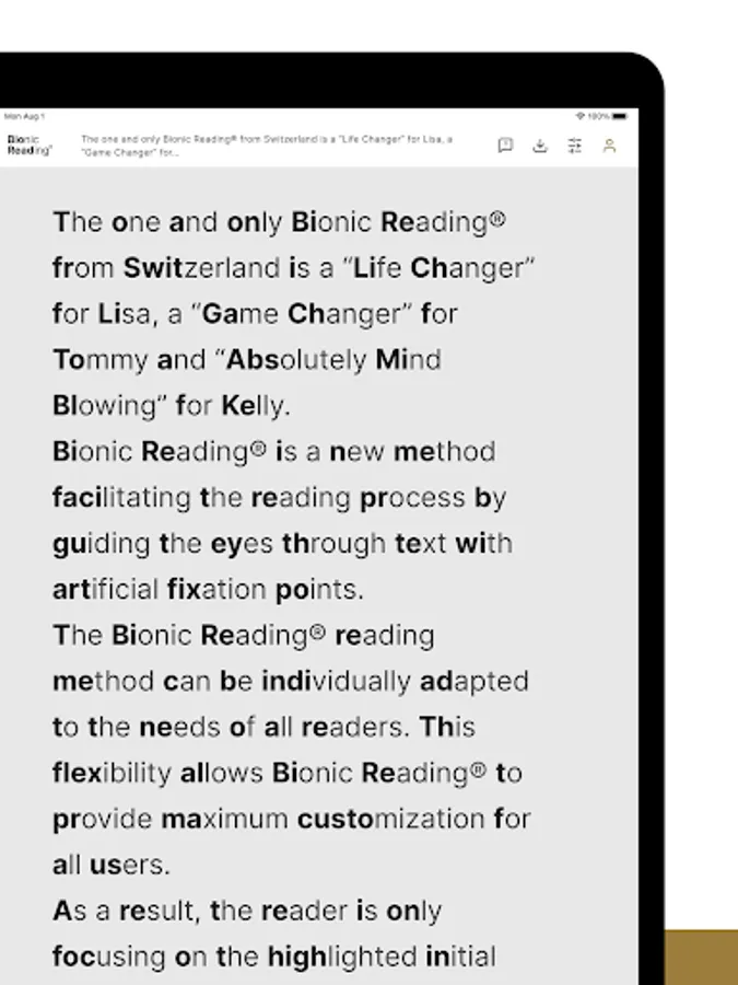 The Bionic Reading® reading mode can be individually adapted to the needs of all readers. This flexibility allows Bionic Reading® to provide maximum customization for all users.