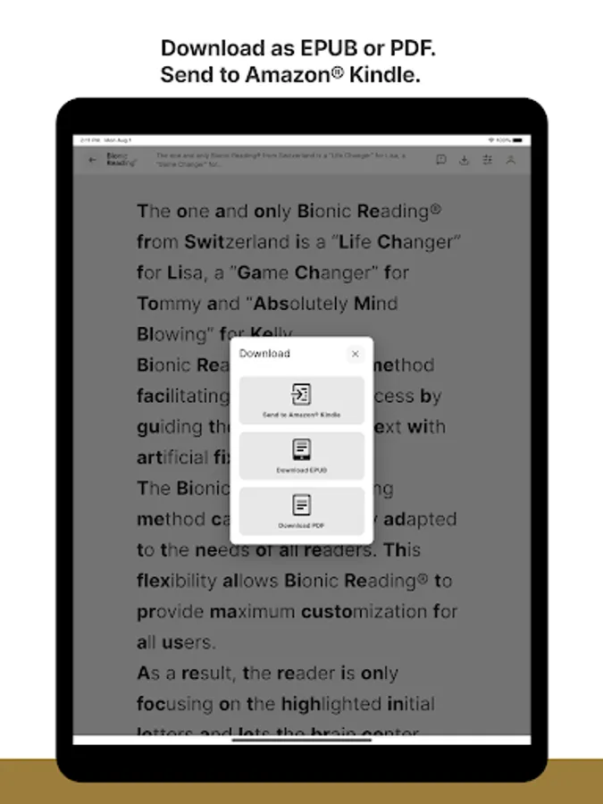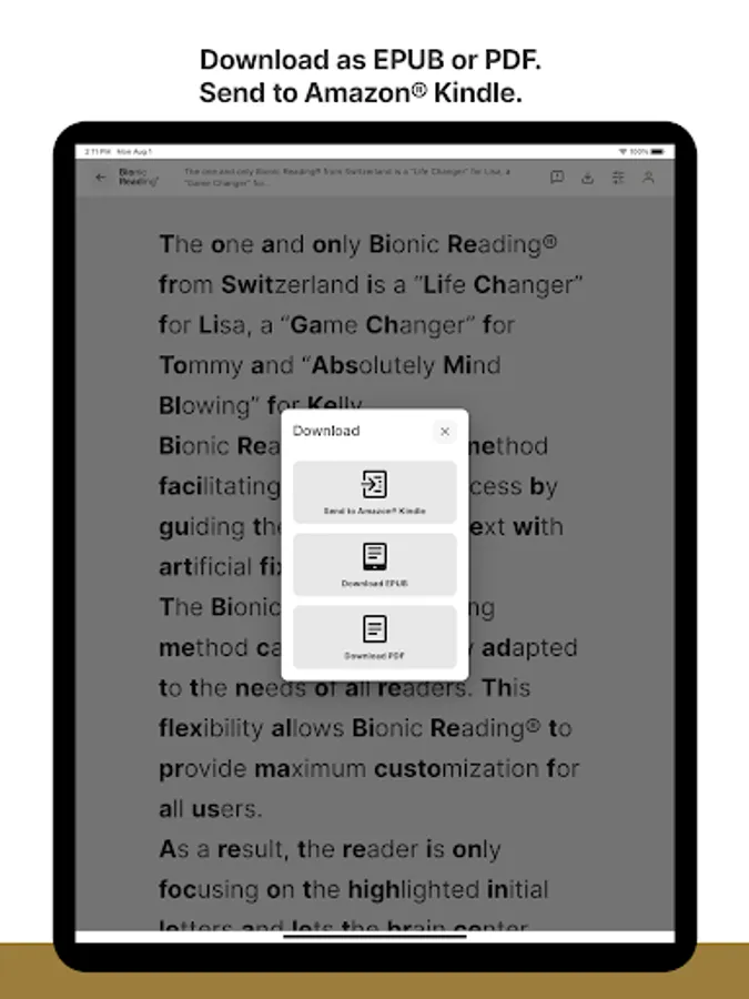 All 6 Bionic Reading® Apps are available as a free or a Premium version – 6 for 1 Price. The one and only from Switzerland is a “Life Changer” for Lisa, a “Game Changer” for Tommy and “Absolutely Mind Blowing” for Kelly.