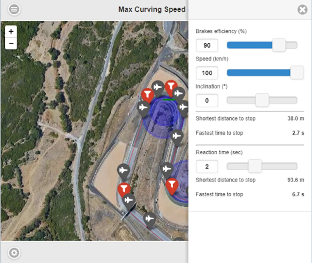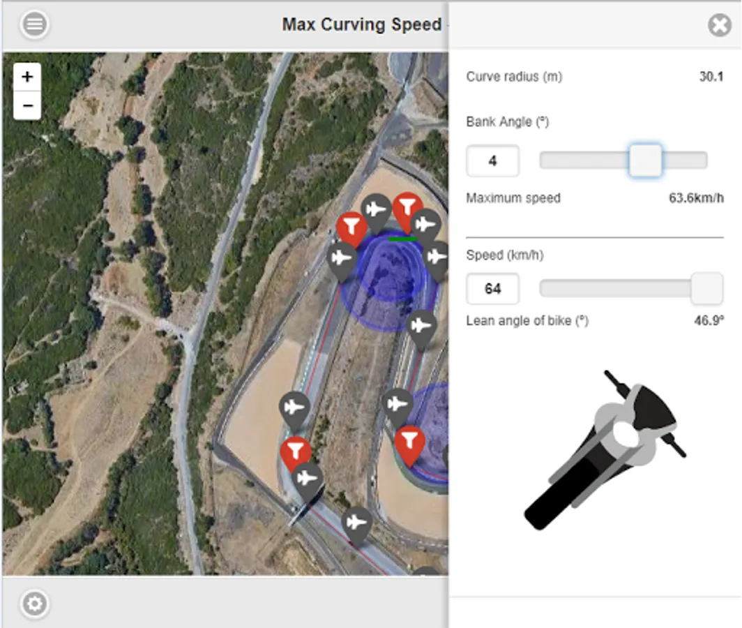 How far can a motorcycle go in a curve? With MCS, you can check your tracks and improve. Check the maximum lean angle for your roads, maximum speeds and minimum distance to brake applied to your reality.