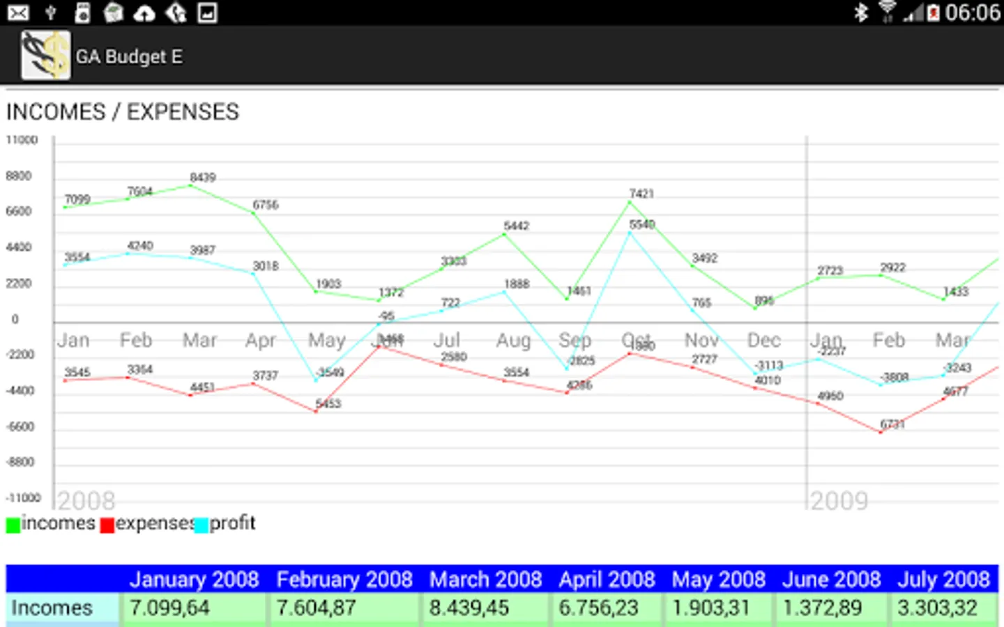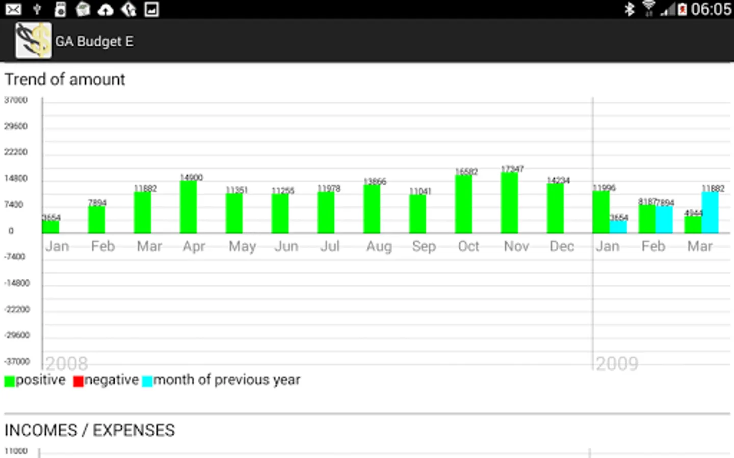 - Incomes and expenses by type and by categories;