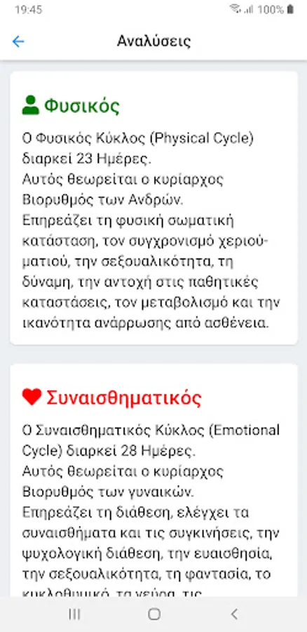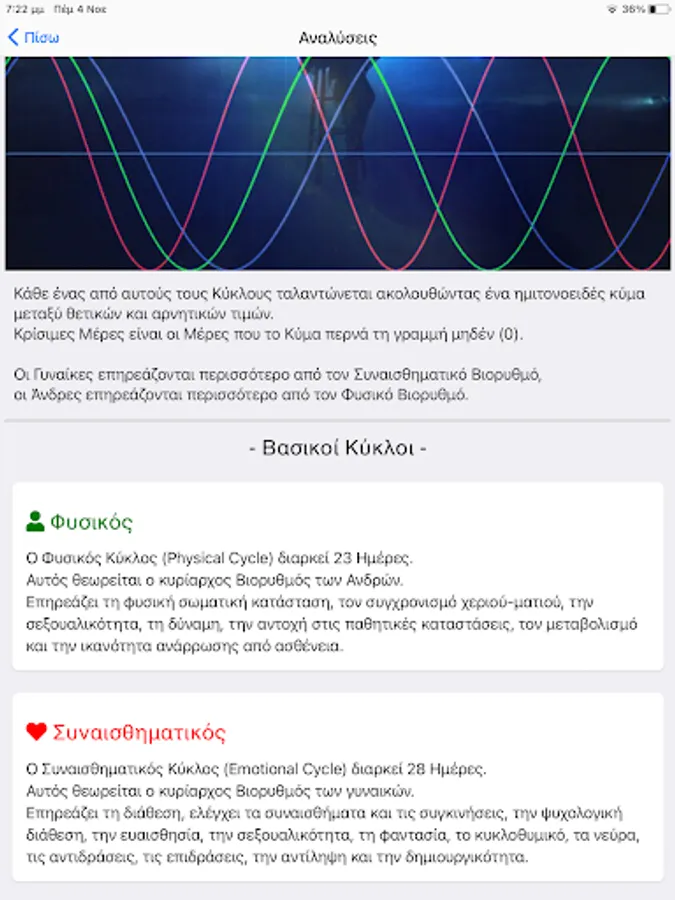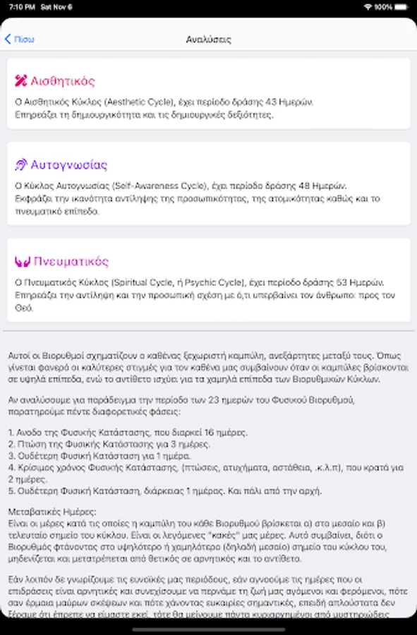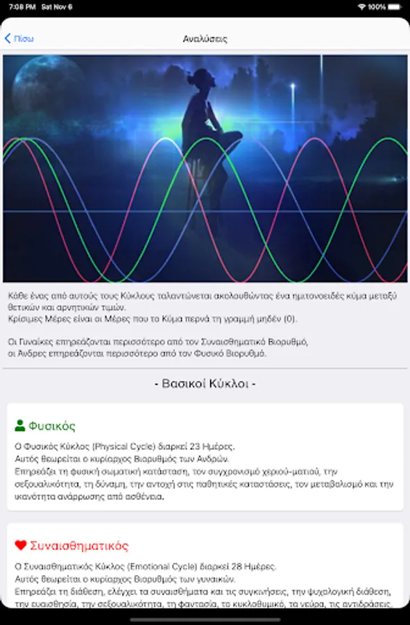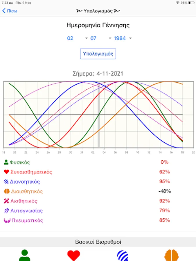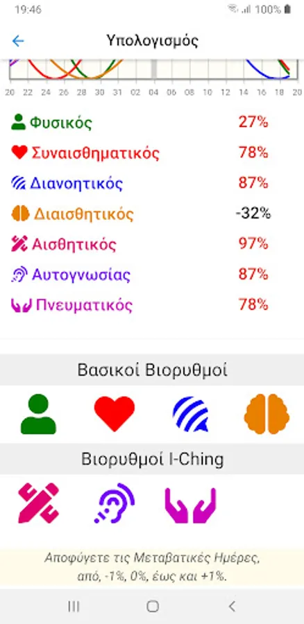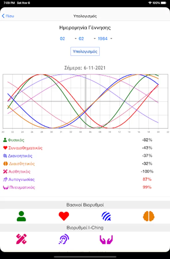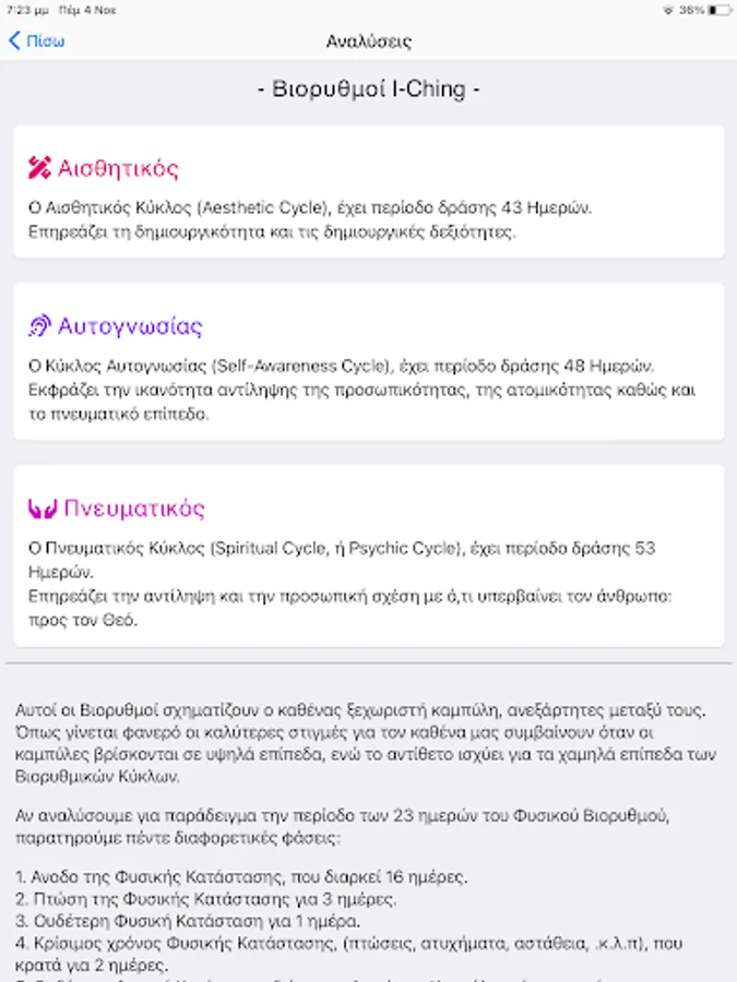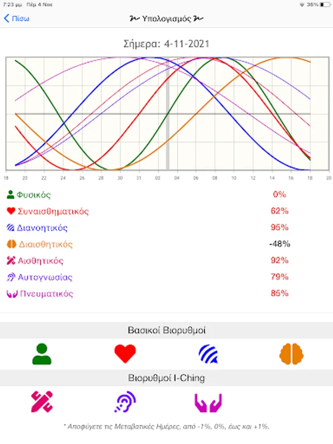 The Biorhythms Application is the only one that examines 3 additional - (out of 4) - important Biorhythm Circles (Internal Biorhythms, or I-Ching Biorhythms).