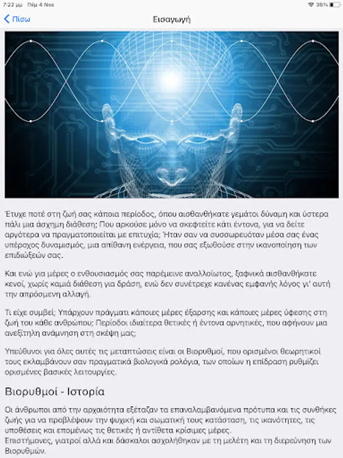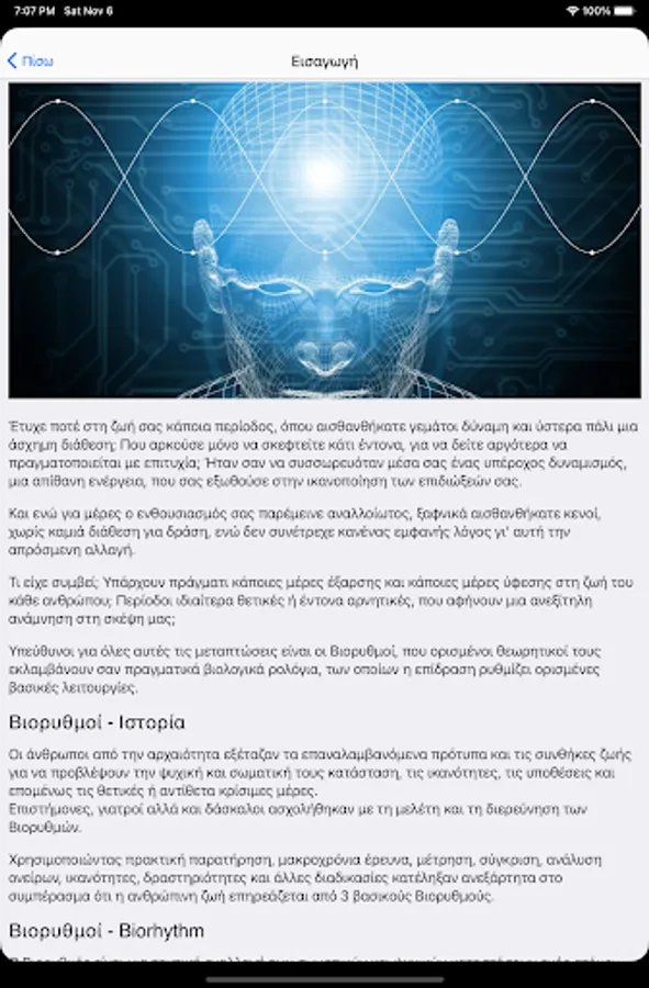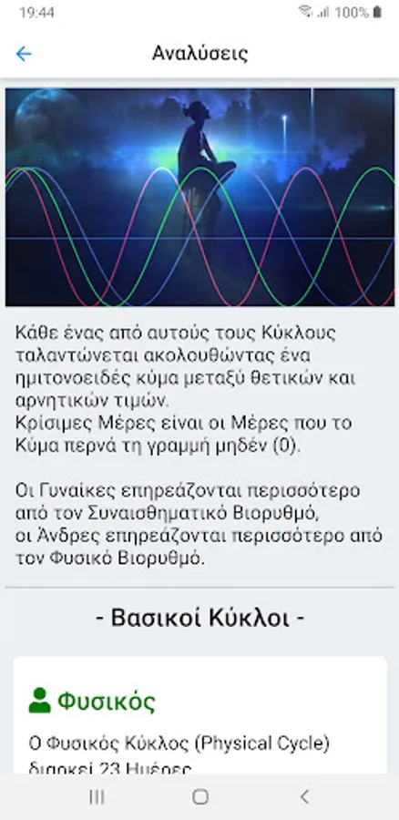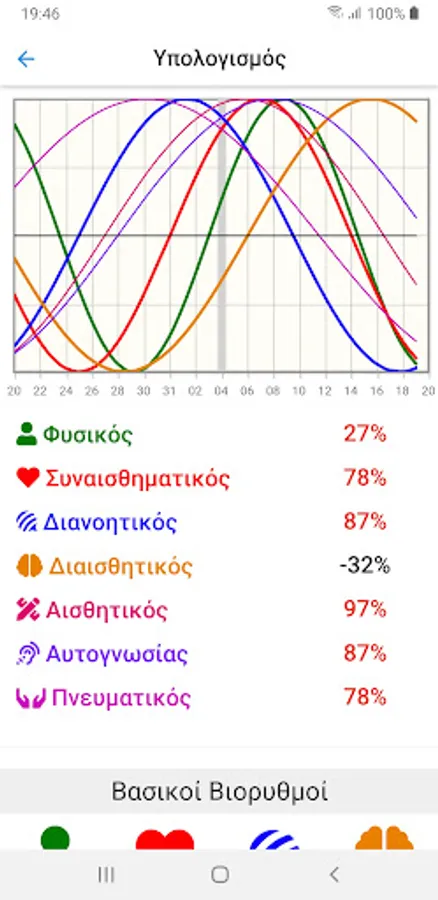 Biorhythms are divided into two categories, the "Internal Biorhythms" (mental and spiritual improvement and development)) and the "External Biorhythms" that are used with the health of the behavior and in general with the external actions of the individual.